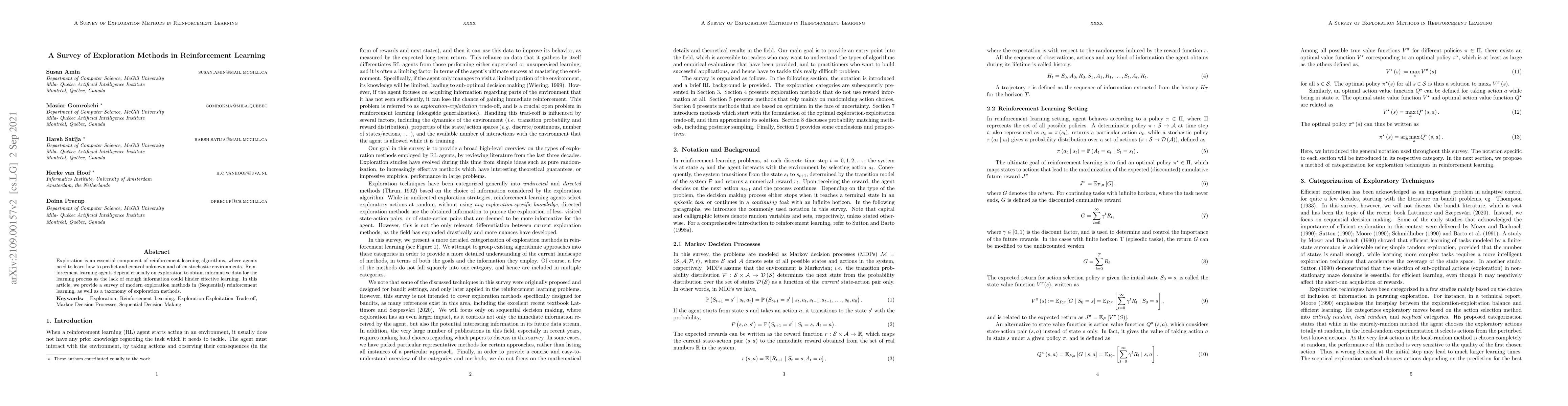 Exploration is an essential component of reinforcement learning algorithms, where agents need to learn how to predict and control unknown and often stochastic environments. Reinforcement learning agents depend crucially on exploration to obtain informative data for the learning process as the lack of enough information could hinder effective learning. In this article, we provide a survey of modern exploration methods in (Sequential) reinforcement learning, as well as a taxonomy of exploration methods.