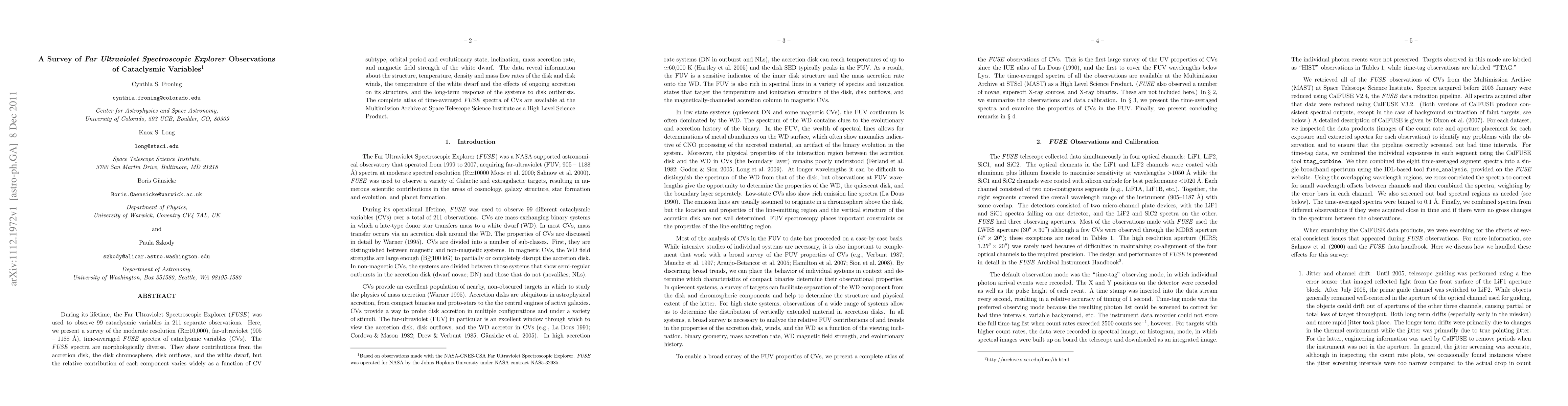 This paper surveys FUSE observations of 99 cataclysmic variables, revealing diverse morphological spectra influenced by various factors like subtype and accretion rate. The data provide insights into the structure and dynamics of the accretion disk and white dwarf.