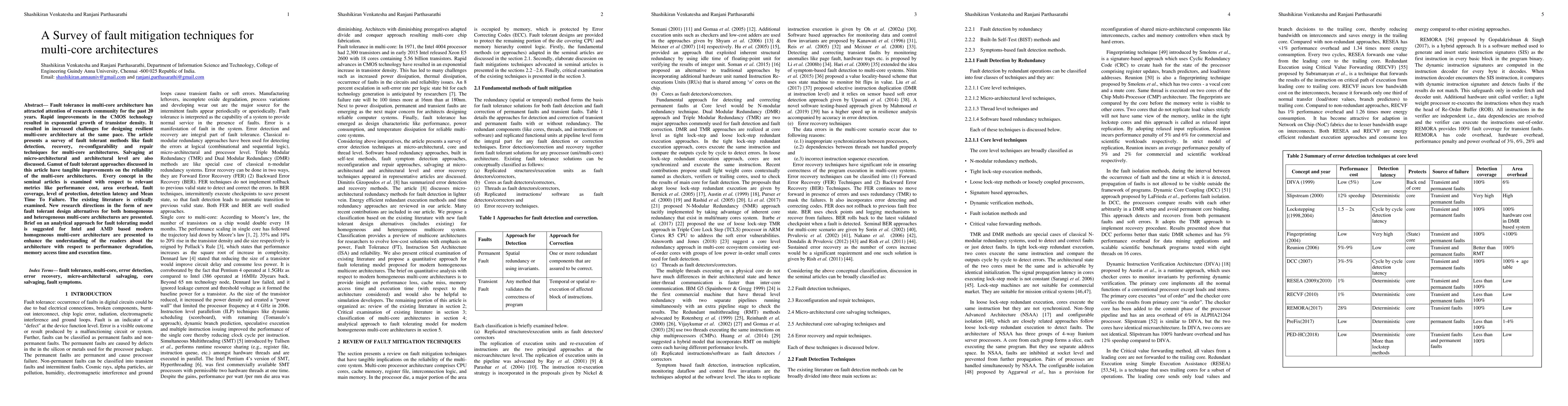 This paper surveys fault mitigation techniques for multi-core architectures, examining fault detection, recovery, and re-configurability methods. It critically analyzes existing literature and proposes new research directions for enhancing reliability, considering performance cost and fault coverage.