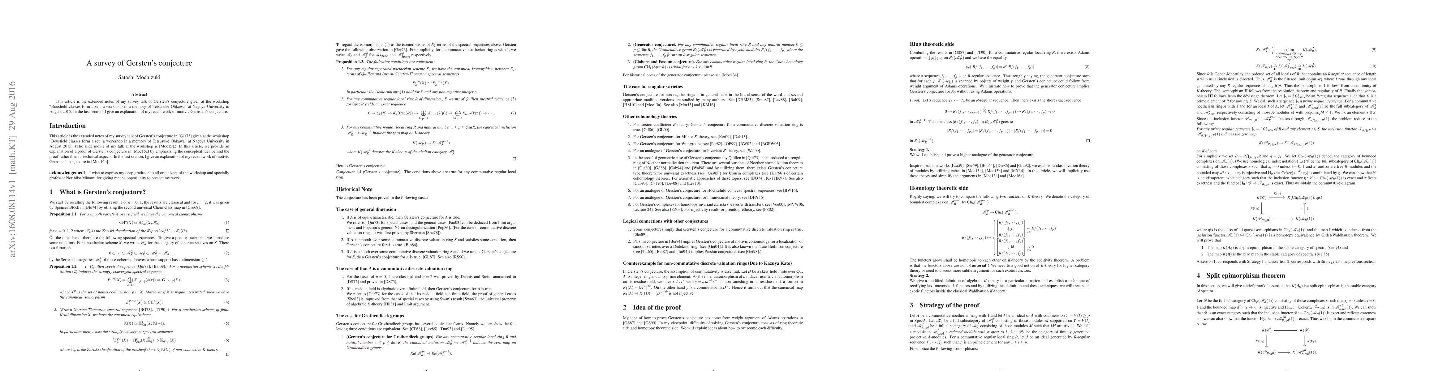 Two-line summary: This paper surveys Gersten's conjecture, a significant topic in algebraic K-theory, and includes an overview of the author's recent contributions to the motivic version of the conjecture, presented at a workshop in memory of Tetsusuke Ohkawa. The survey was originally delivered as a talk at Nagoya University in 2015.