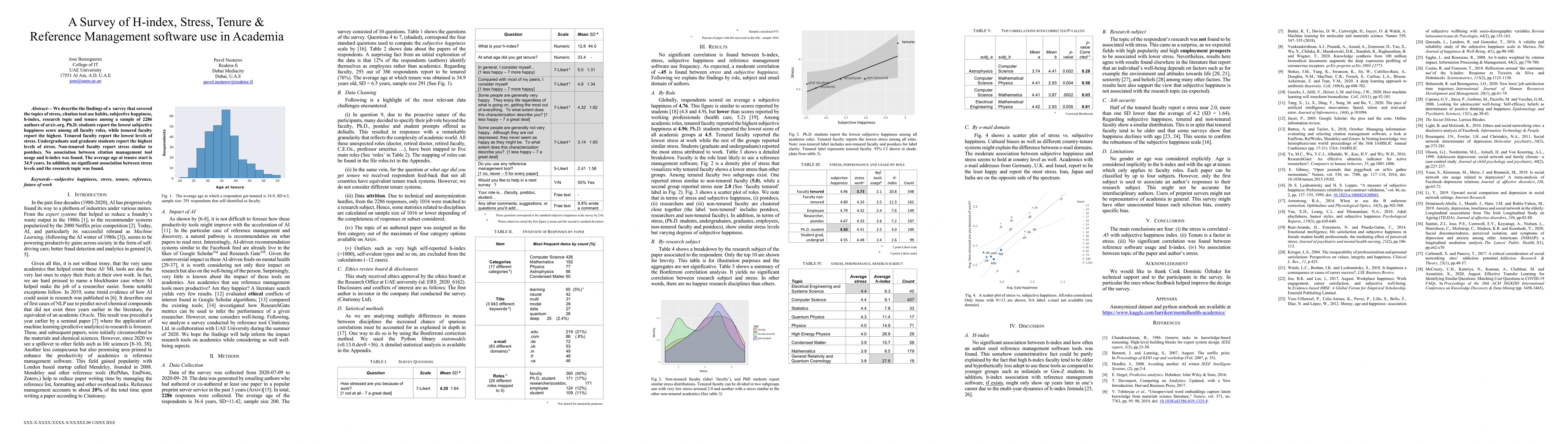 We describe the findings of a survey that covered the topics of stress, citation tool use habits, subjective happiness, h-index, research topic and tenure among a sample of 2286 authors of arxiv.org. Ph.D. students report the lowest subjective happiness score among all faculty roles, while tenured faculty report the highest. Tenured faculty report the lowest levels of stress. Undergraduate and graduate students report the highest levels of stress. Non-tenured faculty report stress similar to postdocs. No association between citation management tool usage and h-index was found. The average age at tenure start is 34.9 years. In addition, no significant association between stress levels and the research topic was found