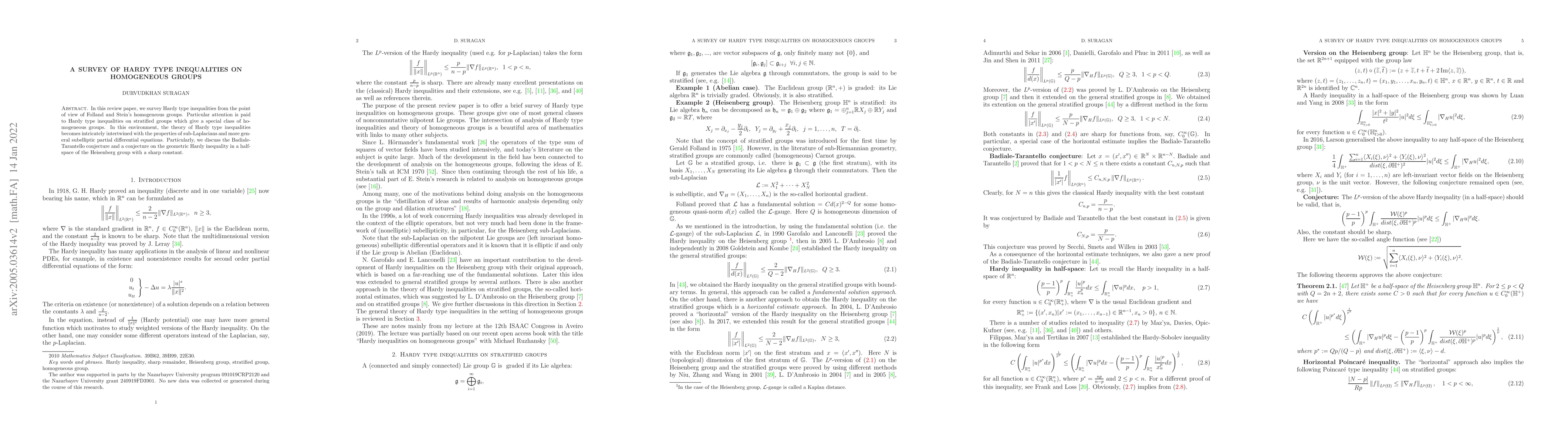 This paper reviews Hardy type inequalities within the context of Folland and Stein's homogeneous groups, focusing on stratified groups and their connection to sub-Laplacians and subelliptic PDEs. It also discusses the Badiale-Tarantello conjecture and a geometric Hardy inequality in the Heisenberg group.
