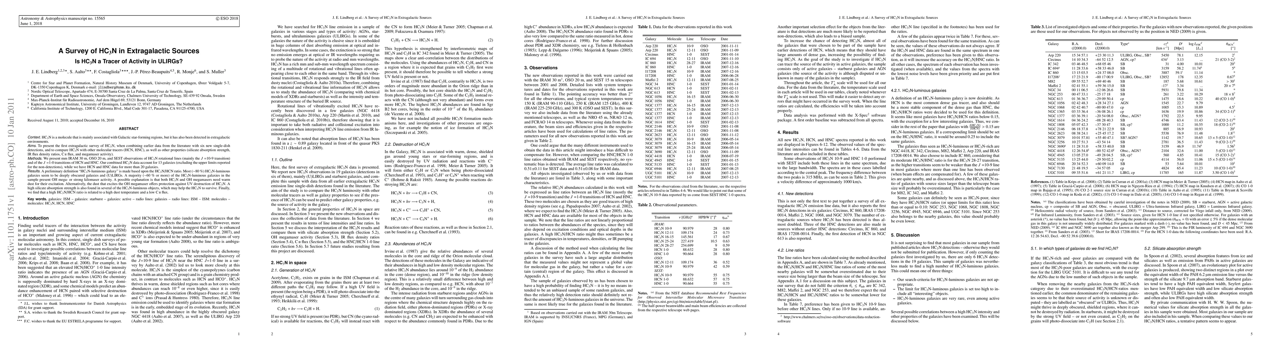 Researchers surveyed HC3N in extragalactic sources, finding that it is a tracer of activity in ULIRGs (Ultra-Luminous Infrared Galaxies) with a strong correlation to silicate absorption strength and OH mega-maser activity.