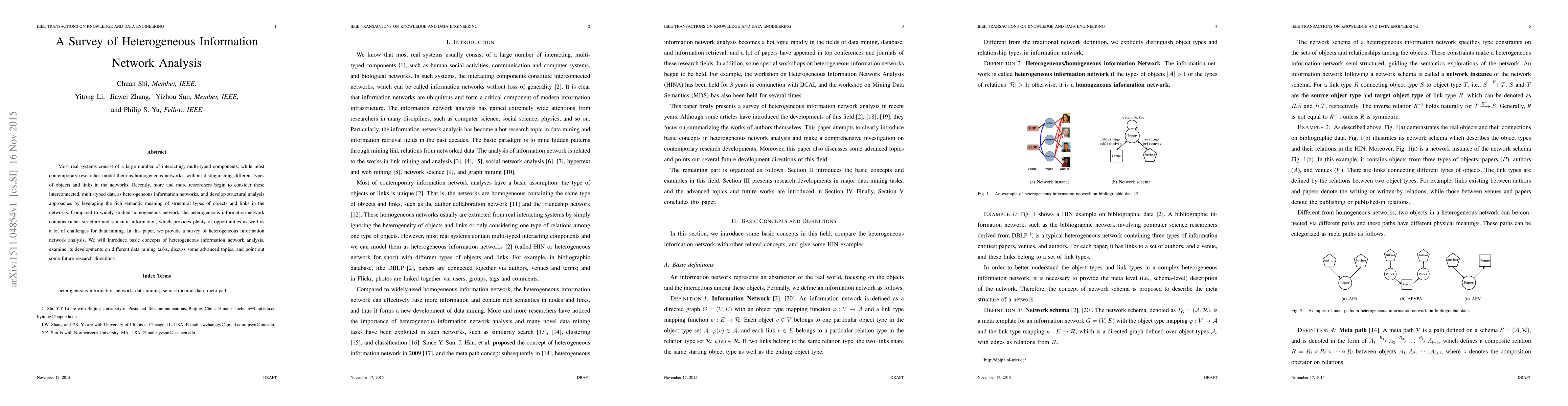 This paper surveys the analysis of heterogeneous information networks, which model complex systems with multi-typed components and links. It discusses the richer structure and semantic opportunities compared to traditional homogeneous networks, reviews developments in data mining tasks, and highlights future research directions.