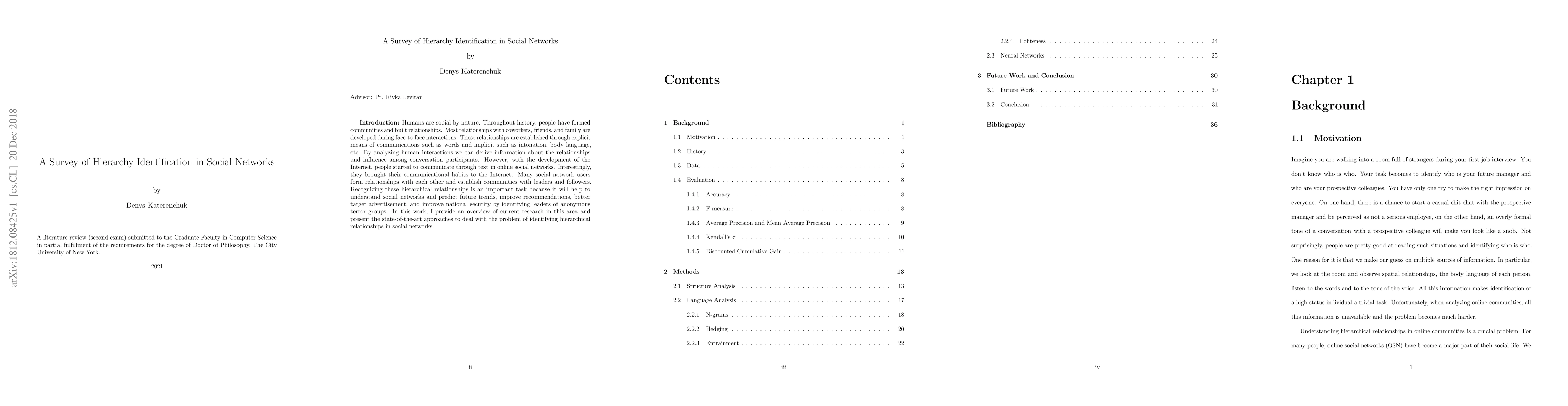 This paper provides an overview of current research on identifying hierarchical relationships in social networks, aiming to improve recommendations, advertisement targeting, and national security by analyzing online interactions.