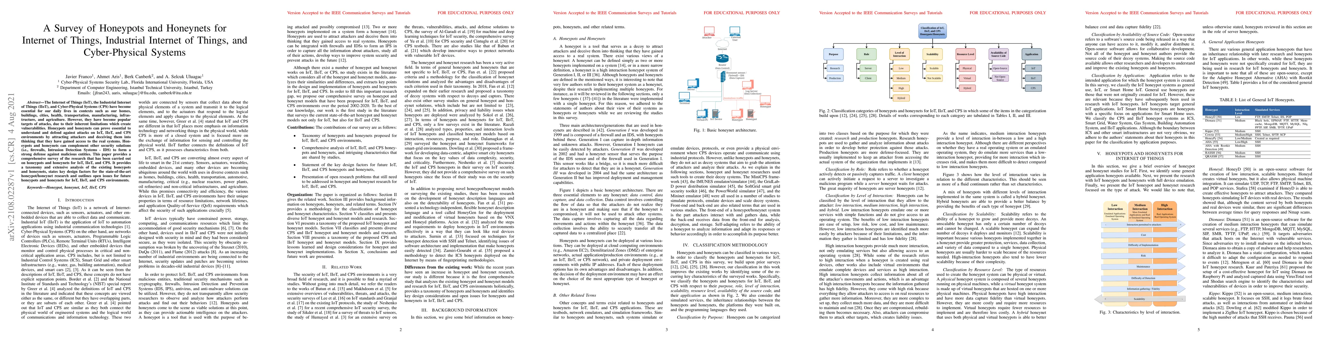 This paper surveys the use of honeypots and honeynets to defend IoT, IIoT, and CPS systems against attacks, providing a taxonomy and analysis of existing solutions, and highlighting key design factors and future research directions.