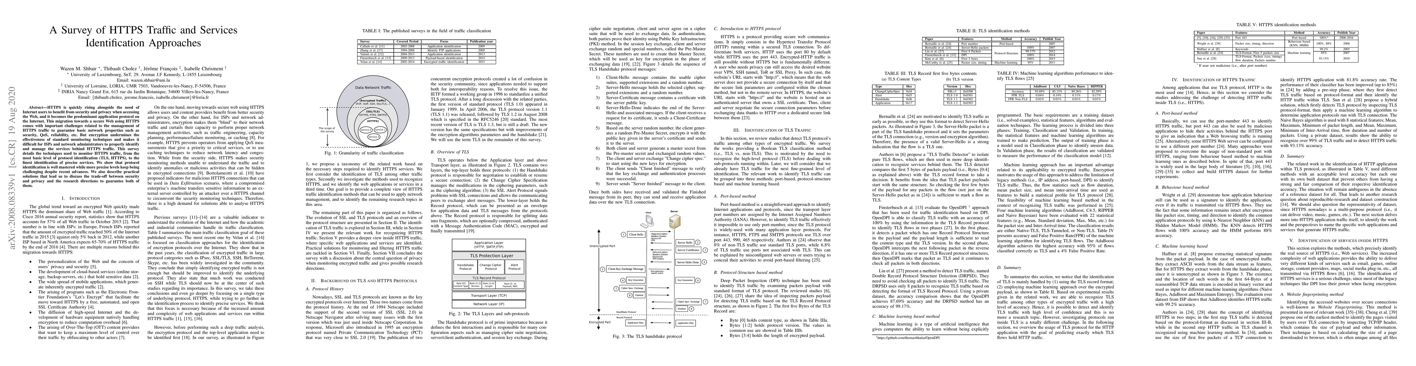 HTTPS is quickly rising alongside the need of Internet users to benefit from security and privacy when accessing the Web, and it becomes the predominant application protocol on the Internet. This migration towards a secure Web using HTTPS comes with important challenges related to the management of HTTPS traffic to guarantee basic network properties such as security, QoS, reliability, etc. But encryption undermines the effectiveness of standard monitoring techniques and makes it difficult for ISPs and network administrators to properly identify and manage the services behind HTTPS traffic. This survey details the techniques used to monitor HTTPS traffic, from the most basic level of protocol identification (TLS, HTTPS), to the finest identification of precise services. We show that protocol identification is well mastered while more precise levels keep being challenging despite recent advances. We also describe practical solutions that lead us to discuss the trade-off between security and privacy and the research directions to guarantee both of them.