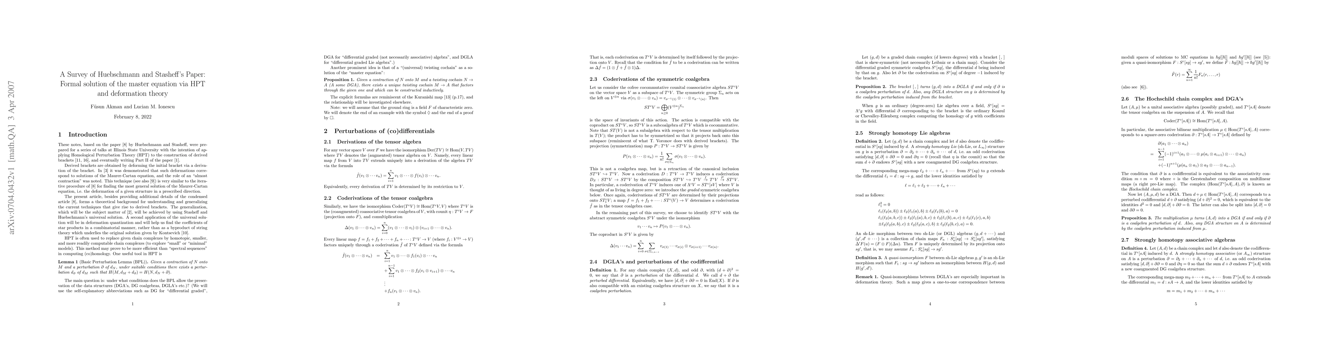 These notes, based on the paper "Formal Solution of the Master Equation via HPT and Deformation Theory" by Huebschmann and Stasheff, were prepared for a series of talks at Illinois State University with the intention of applying Homological Perturbation Theory to the derived bracket constructions of Kosmann-Schwarzbach and T. Voronov, and eventually writing Part II of the paper "Higher Derived Brackets and Deformation Theory I" by the present authors.