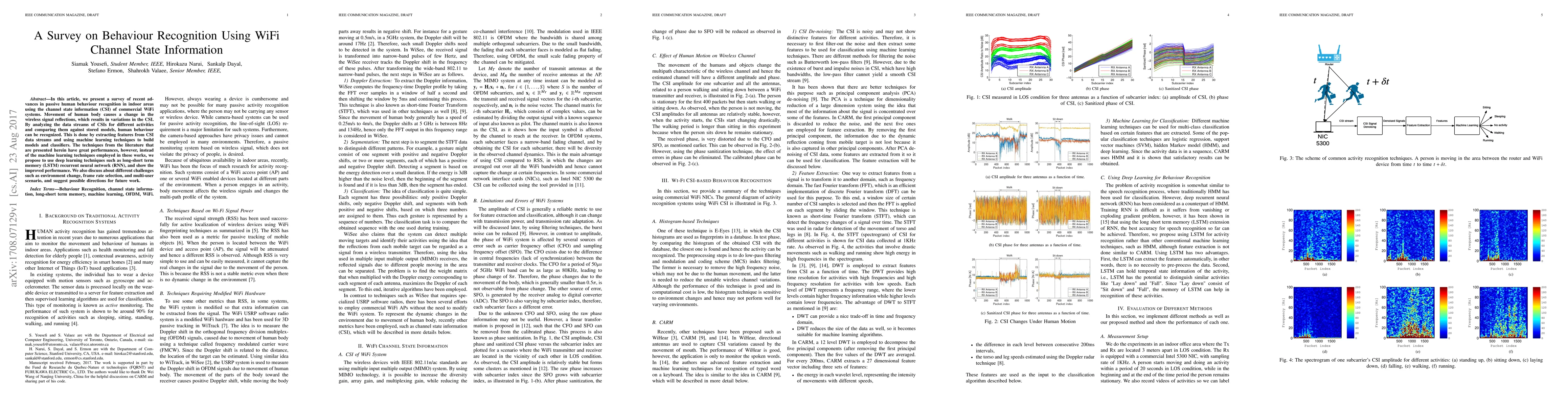 This paper surveys recent advances in human activity recognition using WiFi CSI, focusing on passive indoor tracking via signal reflection changes. The authors propose deep learning techniques like LSTM RNNs for improved performance and discuss challenges like environment variability and multi-user scenarios.