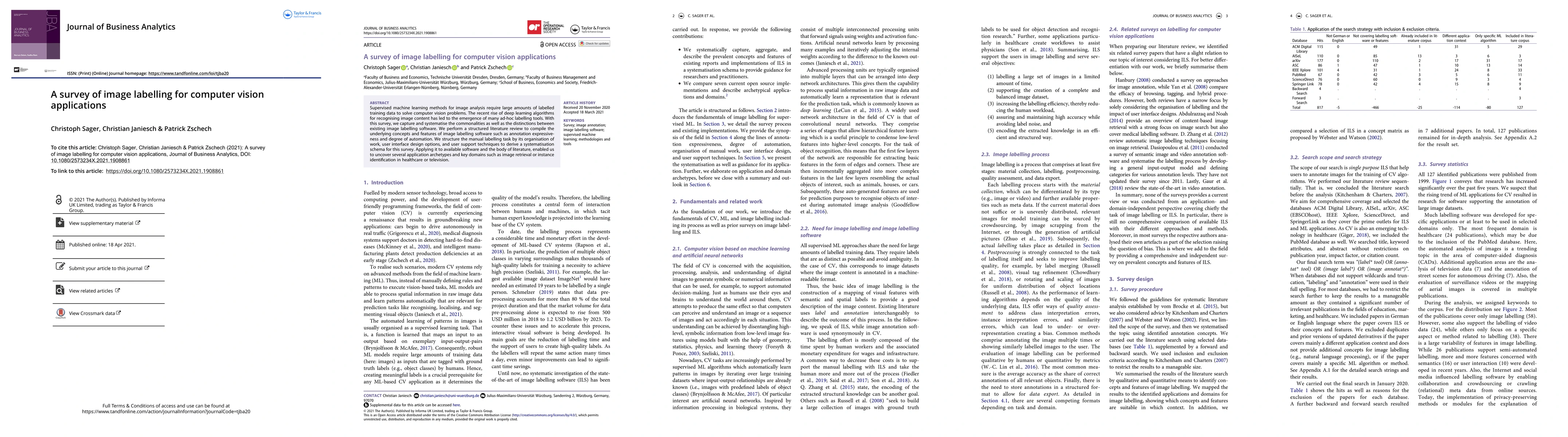 Supervised machine learning methods for image analysis require large amounts of labelled training data to solve computer vision problems. The recent rise of deep learning algorithms for recognising image content has led to the emergence of many ad-hoc labelling tools. With this survey, we capture and systematise the commonalities as well as the distinctions between existing image labelling software. We perform a structured literature review to compile the underlying concepts and features of image labelling software such as annotation expressiveness and degree of automation. We structure the manual labelling task by its organisation of work, user interface design options, and user support techniques to derive a systematisation schema for this survey. Applying it to available software and the body of literature, enabled us to uncover several application archetypes and key domains such as image retrieval or instance identification in healthcare or television.