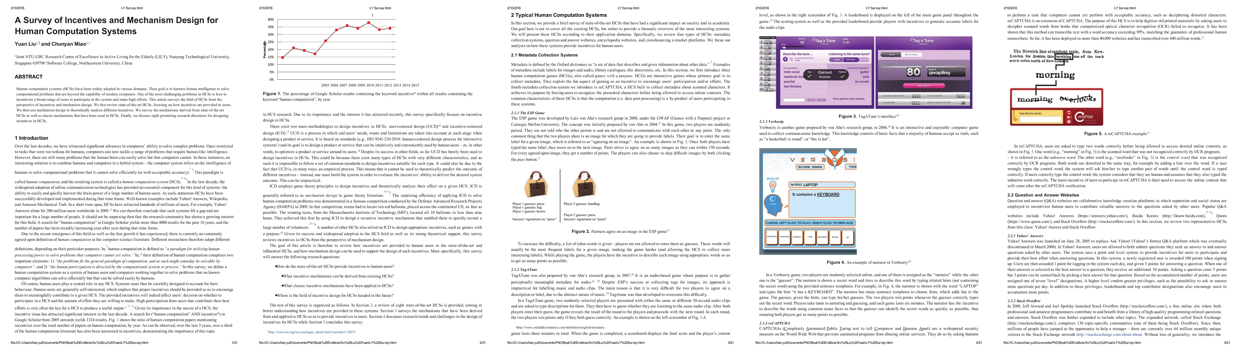 This paper surveys human computation systems (HCSs) with a focus on incentives and mechanism design to motivate user participation. It reviews existing HCSs, analyzes various incentive mechanisms, and outlines eight promising research directions for future incentive design.