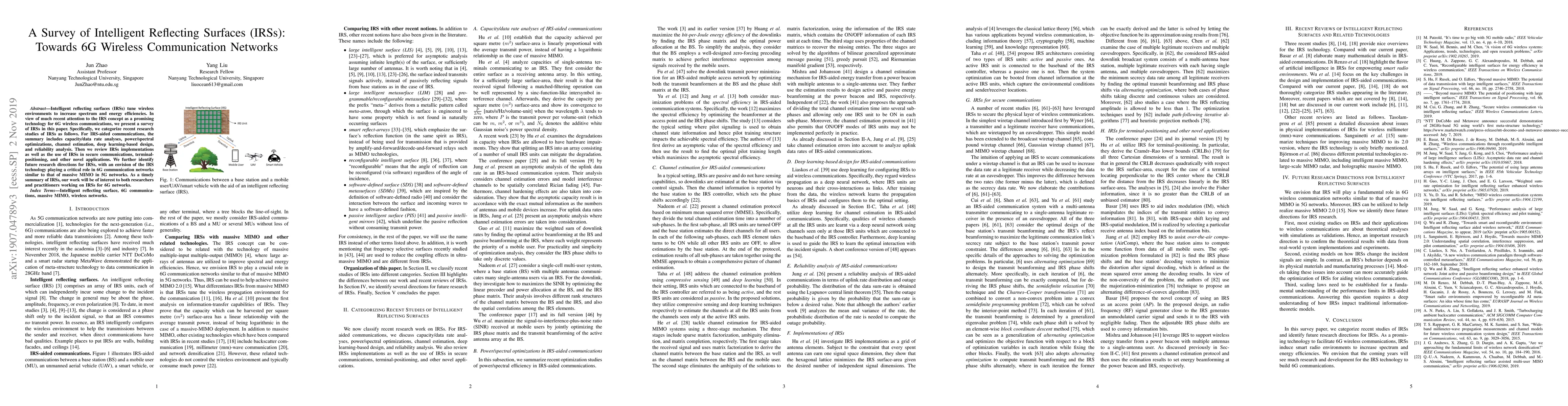 This paper surveys intelligent reflecting surfaces (IRSs) as a promising technology for 6G wireless communications, categorizing research into IRS-aided communications, implementations, and novel applications, and identifying future research directions. The study envisions IRSs playing a critical role in 6G networks akin to massive MIMO in 5G.