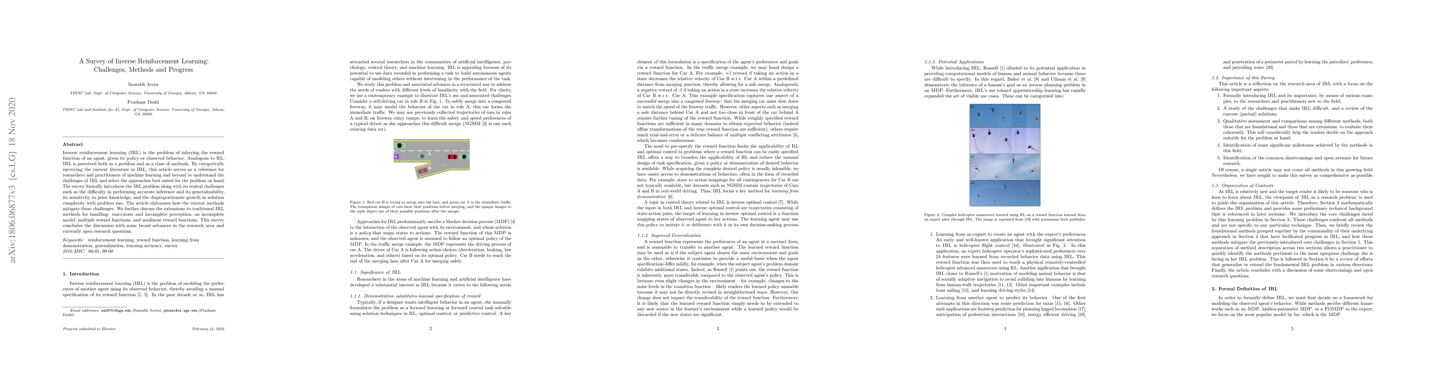 This paper surveys inverse reinforcement learning (IRL), detailing its challenges and methods, and highlighting progress in addressing issues like inference accuracy, generalizability, and complexity. It also discusses extensions to handle various IRL complexities and concludes with recent advances and open questions.