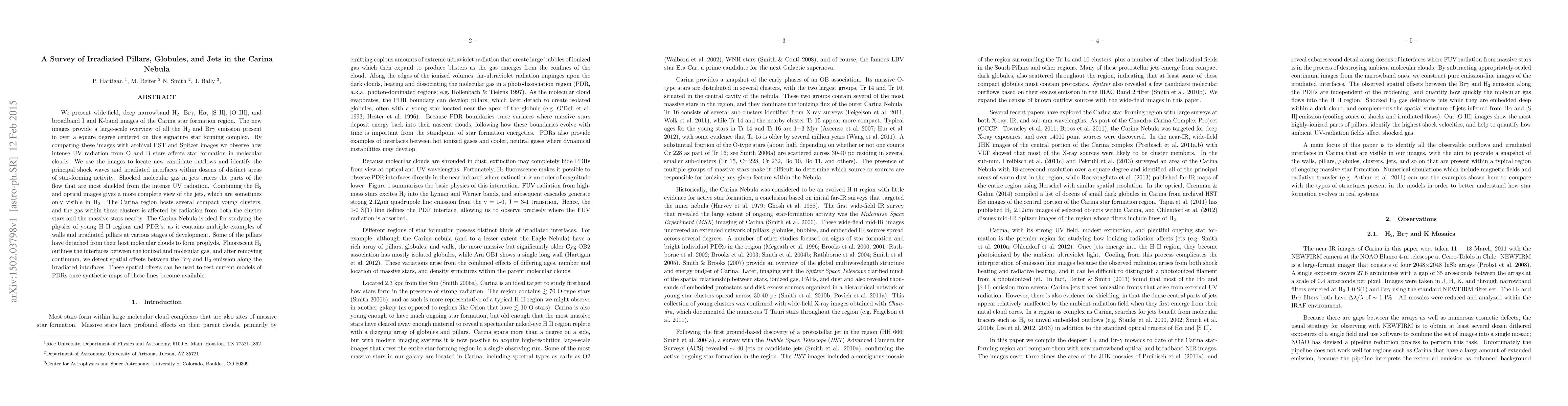 This paper surveys the Carina Nebula's star formation region using wide-field, deep narrowband images to identify irradiated pillars, globules, and jets. The study reveals the impact of intense UV radiation from nearby O and B stars on molecular clouds, highlighting the locations of new outflows and principal shock waves within star-forming areas.
