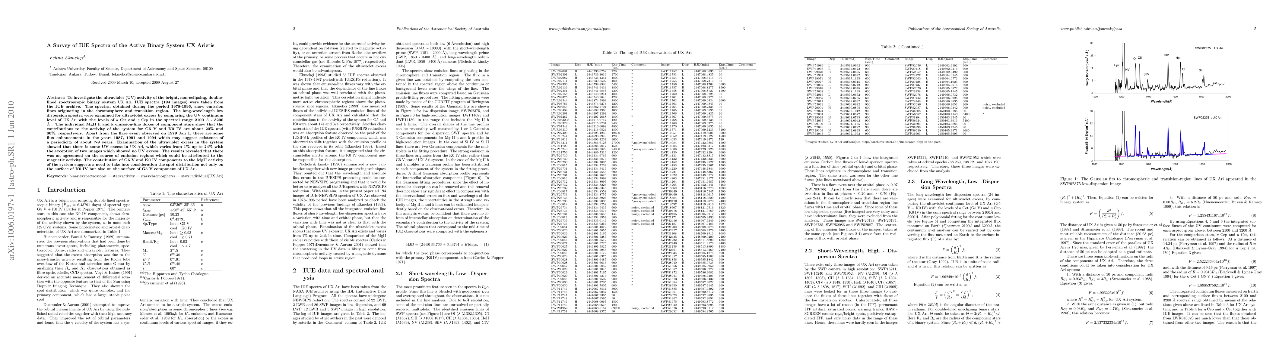 To investigate the ultraviolet (UV) activity of the bright, non-eclipsing, double-lined spectroscopic binary system UX Ari, IUE spectra (194 images) were taken from the IUE archive. The spectra, obtained during the period 1978-1996, show emission lines originating in the chromosphere and transition region. The long-wavelength low dispersion spectra were examined for ultraviolet excess by comparing the UV continuum level of UX Ari with the levels of $\kappa$ Cet and $\eta$ Cep in the spectral range 2100 $\AA$ - 3200 $\AA$ . The individual MgII h and k emission-line fluxes of component stars show that the contributions to the activity of the system for G5 V and K0 IV are about 20% and 80%, respectively. Apart from the flare event observed on 1979 Jan 1, there are some flux enhancements in the years 1987, 1991 and 1994 which may suggest existence of a periodicity of about 7-9 years. Examination of the ultraviolet excess in the system showed that there is some UV excess in UX Ari, which varies from 1% up to 24% with the exception of two images which showed no UV excess. The results revealed that there was an agreement on the source of emission regions which could be attributed to the magnetic activity. The contribution of G5 V and K0 IV components to the MgII activity of the system suggests a need to take into consideration the spot distribution not only on the surface of K0 IV but also on the surface of G5 V component of UX Ari.