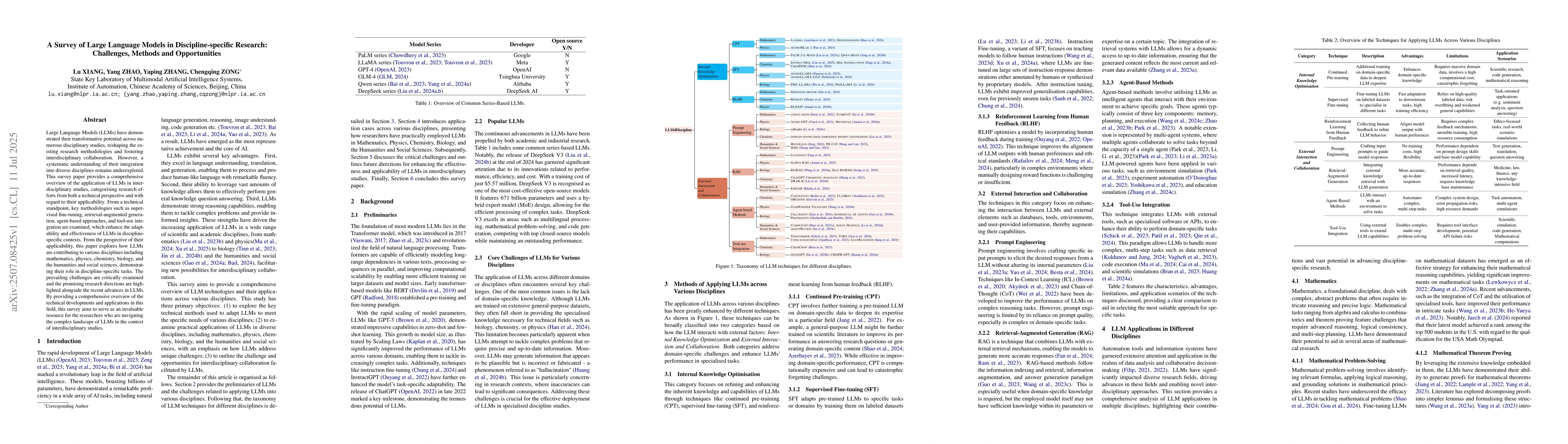 Large Language Models (LLMs) have demonstrated their transformative potential across numerous disciplinary studies, reshaping the existing research methodologies and fostering interdisciplinary collaboration. However, a systematic understanding of their integration into diverse disciplines remains underexplored. This survey paper provides a comprehensive overview of the application of LLMs in interdisciplinary studies, categorising research efforts from both a technical perspective and with regard to their applicability. From a technical standpoint, key methodologies such as supervised fine-tuning, retrieval-augmented generation, agent-based approaches, and tool-use integration are examined, which enhance the adaptability and effectiveness of LLMs in discipline-specific contexts. From the perspective of their applicability, this paper explores how LLMs are contributing to various disciplines including mathematics, physics, chemistry, biology, and the humanities and social sciences, demonstrating their role in discipline-specific tasks. The prevailing challenges are critically examined and the promising research directions are highlighted alongside the recent advances in LLMs. By providing a comprehensive overview of the technical developments and applications in this field, this survey aims to serve as an invaluable resource for the researchers who are navigating the complex landscape of LLMs in the context of interdisciplinary studies.