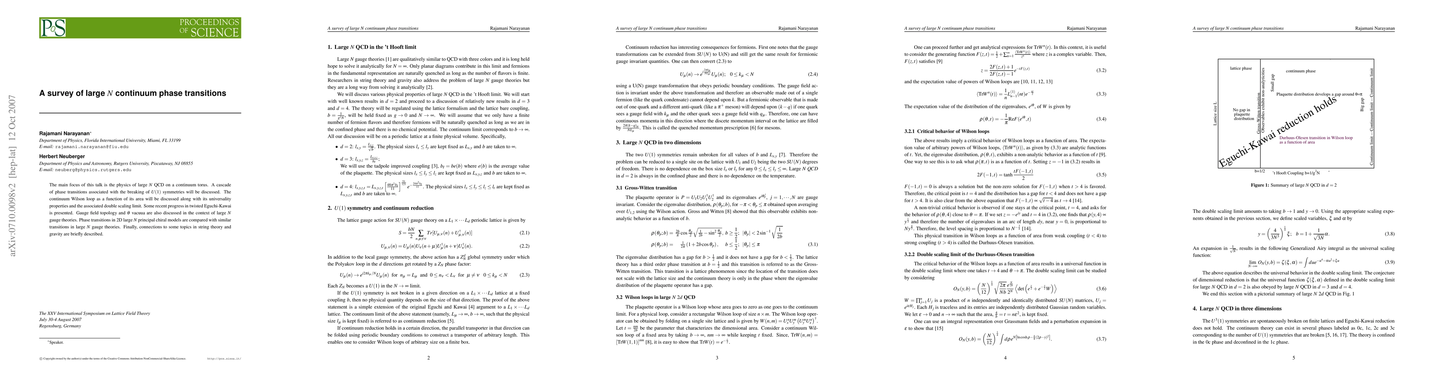 The main focus of this talk is the physics of large N QCD on a continuum torus. A cascade of phase transitions associated with the breaking of U(1) symmetries will be discussed. The continuum Wilson loop as a function of its area will be discussed along with its universality properties and the associated double scaling limit. Some recent progress in twisted Eguchi-Kawai is presented. Gauge field topology and $\theta$ vacuua are also discussed in the context of large N gauge theories. Phase transitions in 2D large N principal chiral models are compared with similar transitions in large $N$ gauge theories. Finally, connections to some topics in string theory and gravity are briefly described.