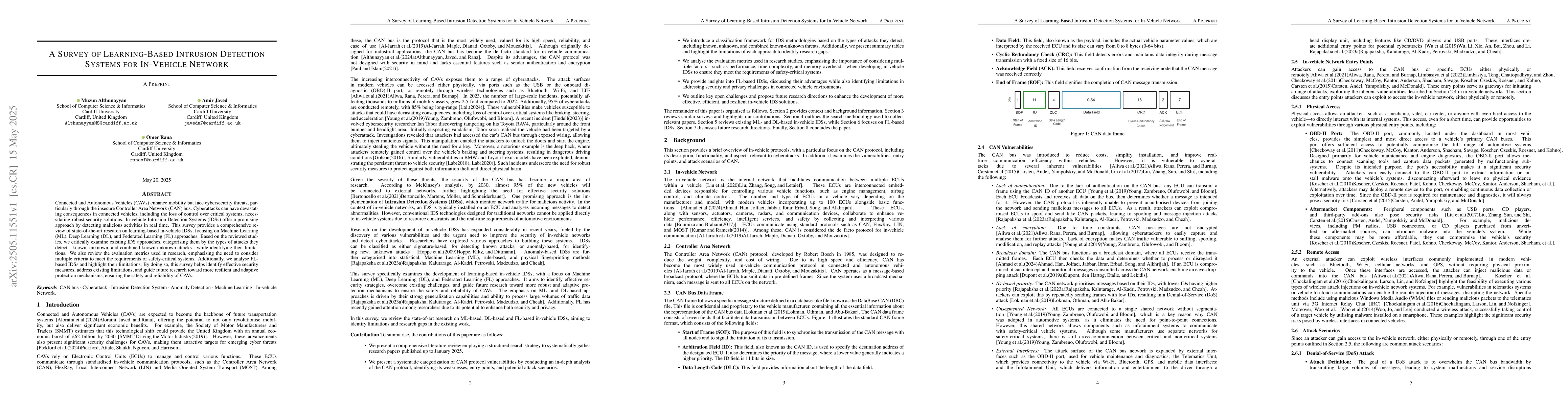 The paper offers a detailed survey of learning-based IDSs for in-vehicle networks, highlighting their strengths, weaknesses, and future research directions.