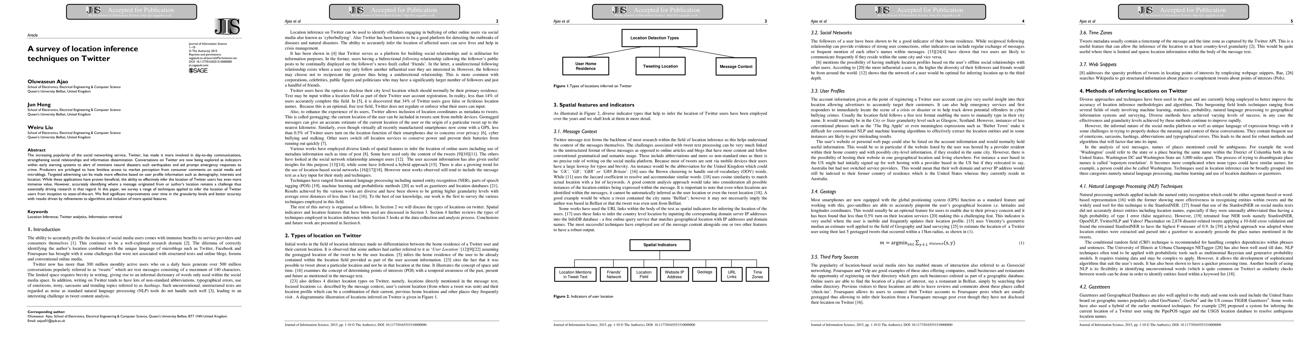 This paper surveys techniques for inferring Twitter users' locations, highlighting improvements in granularity and accuracy driven by algorithmic refinements and spatial features. It underscores the importance of location inference for applications like disaster warning systems and targeted advertising.