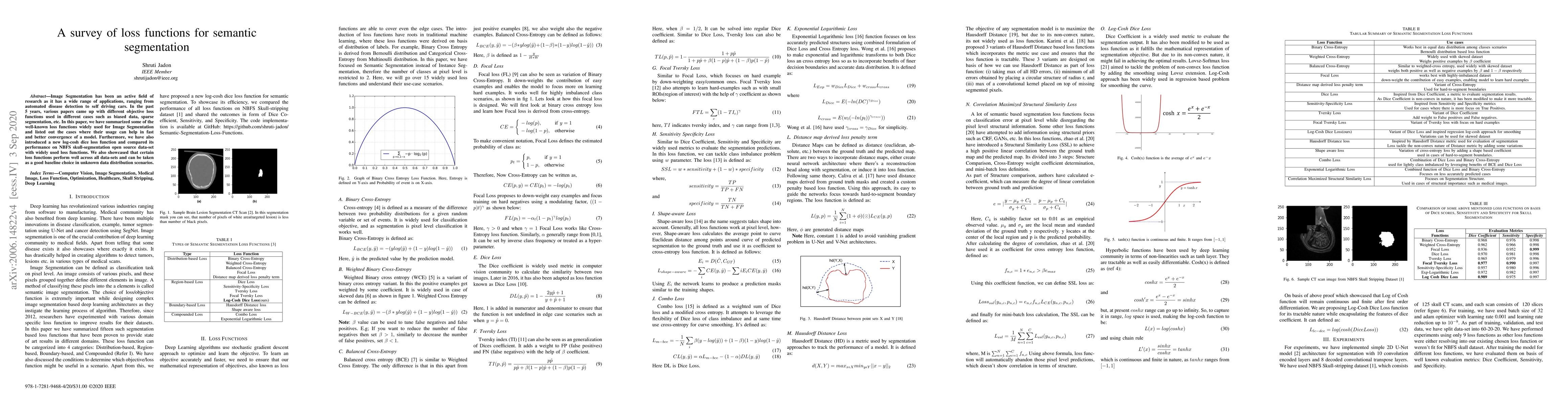 This paper surveys various loss functions for semantic segmentation, highlighting their applications and effectiveness in different scenarios. It introduces a new log-cosh dice loss function and demonstrates its performance compared to existing methods, suggesting some loss functions serve as robust baselines for unknown data distributions.