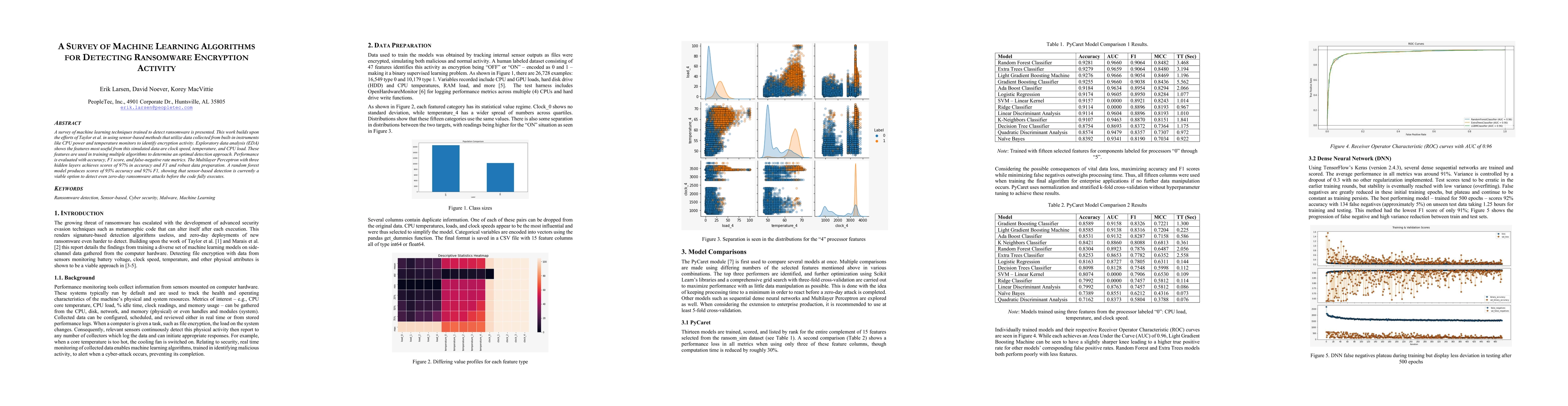 A survey of machine learning techniques trained to detect ransomware is presented. This work builds upon the efforts of Taylor et al. in using sensor-based methods that utilize data collected from built-in instruments like CPU power and temperature monitors to identify encryption activity. Exploratory data analysis (EDA) shows the features most useful from this simulated data are clock speed, temperature, and CPU load. These features are used in training multiple algorithms to determine an optimal detection approach. Performance is evaluated with accuracy, F1 score, and false-negative rate metrics. The Multilayer Perceptron with three hidden layers achieves scores of 97% in accuracy and F1 and robust data preparation. A random forest model produces scores of 93% accuracy and 92% F1, showing that sensor-based detection is currently a viable option to detect even zero-day ransomware attacks before the code fully executes.