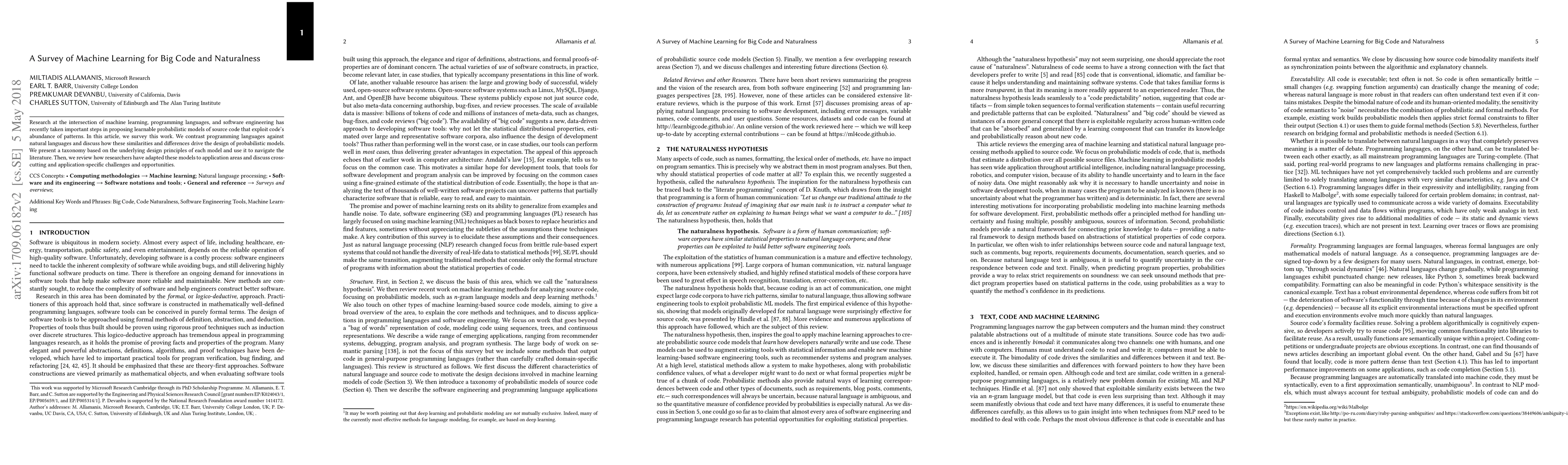 Research at the intersection of machine learning, programming languages, and software engineering has recently taken important steps in proposing learnable probabilistic models of source code that exploit code's abundance of patterns. In this article, we survey this work. We contrast programming languages against natural languages and discuss how these similarities and differences drive the design of probabilistic models. We present a taxonomy based on the underlying design principles of each model and use it to navigate the literature. Then, we review how researchers have adapted these models to application areas and discuss cross-cutting and application-specific challenges and opportunities.