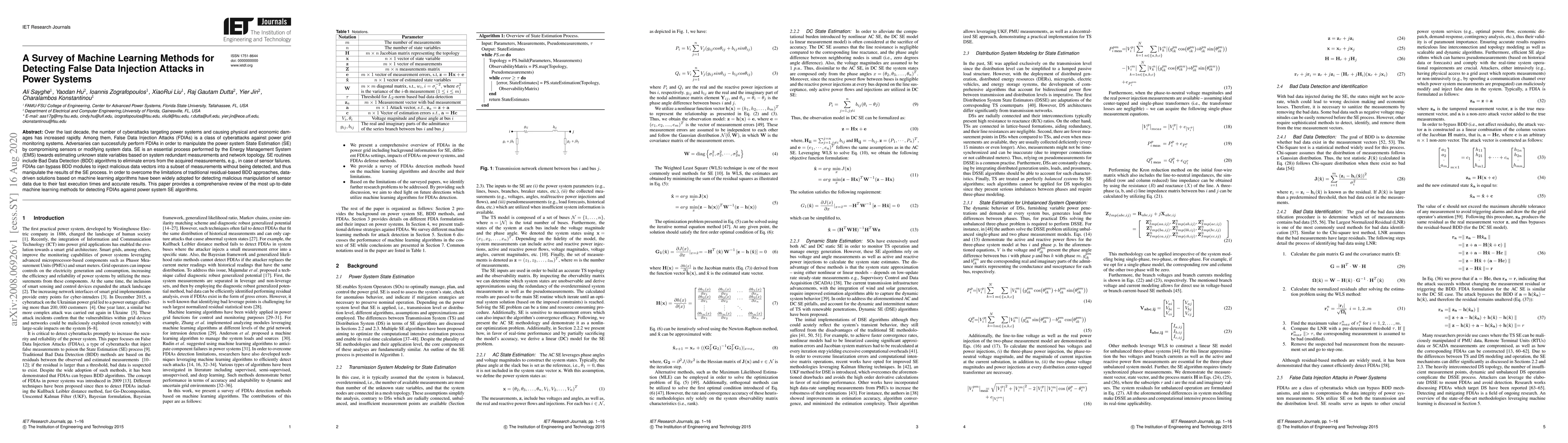 This paper reviews advanced machine learning techniques for detecting False Data Injection Attacks (FDIAs) in power systems, focusing on methods that enhance the accuracy and speed of identifying manipulated sensor data to safeguard State Estimation processes.