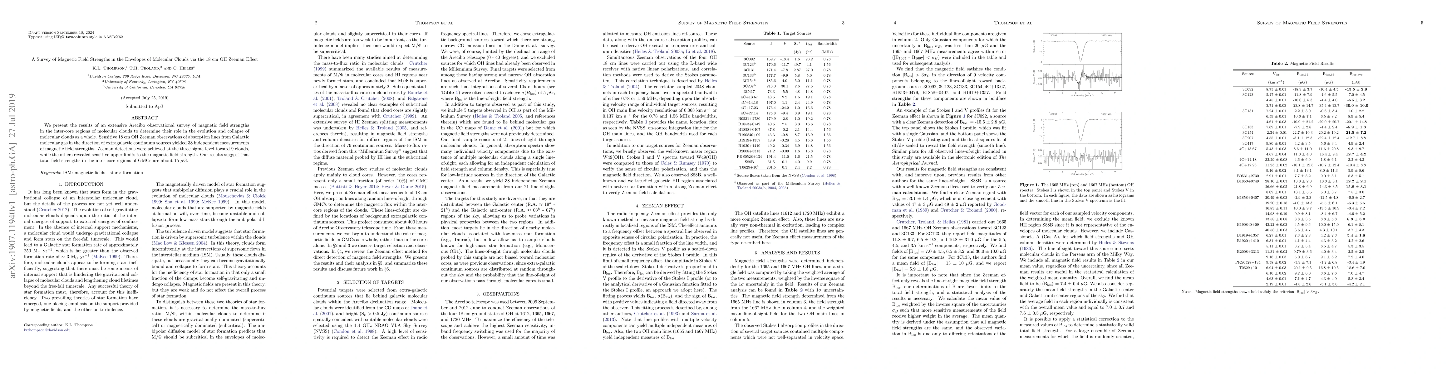We present the results of an extensive Arecibo observational survey of magnetic field strengths in the inter-core regions of molecular clouds to determine their role in the evolution and collapse of molecular clouds as a whole. Sensitive 18 cm OH Zeeman observations of absorption lines from Galactic molecular gas in the direction of extragalactic continuum sources yielded 38 independent measurements of magnetic field strengths. Zeeman detections were achieved at the three sigma level toward 9 clouds, while the others revealed sensitive upper limits to the magnetic field strength. Our results suggest that total field strengths in the inter-core regions of GMCs are about 15 microgauss.
