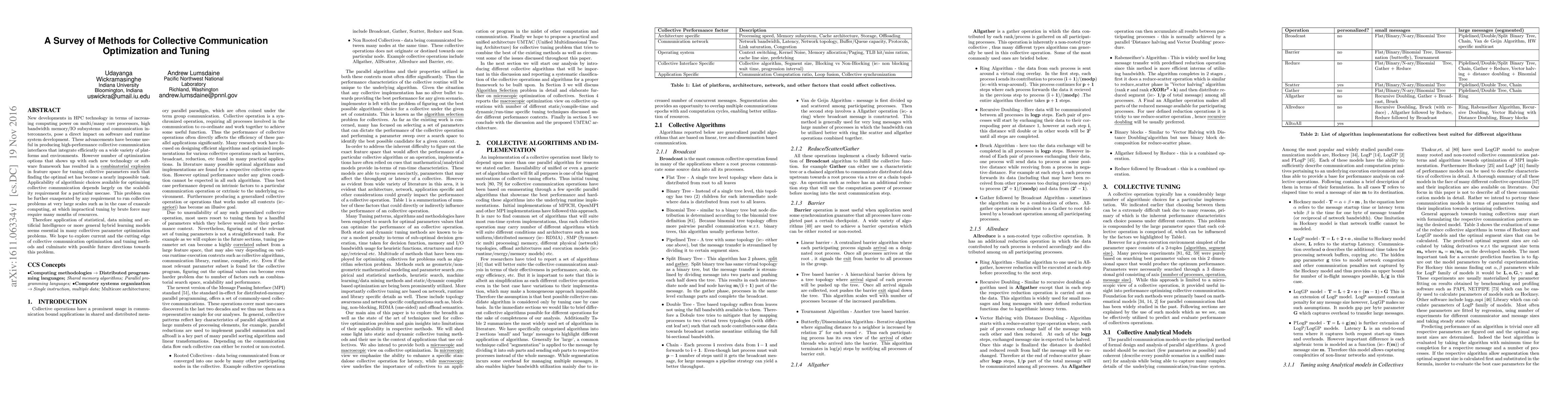 The paper surveys methods for optimizing collective communication in high-performance computing (HPC), highlighting the combinatorial explosion of optimization options with new technologies. It emphasizes the need for statistical, data mining, and AI techniques to efficiently tackle this problem, especially for exascale computing, and explores current and future optimization directions.