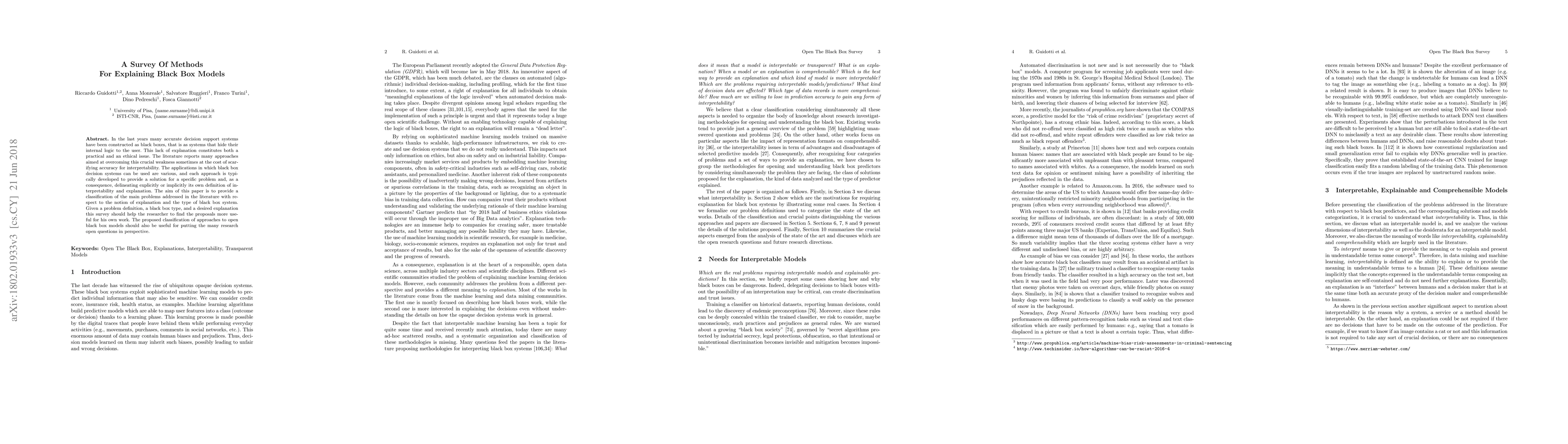 This paper surveys methods for explaining black box models, addressing the practical and ethical issues of their lack of transparency. It classifies various approaches to interpretability, helping researchers find suitable solutions for their specific problems and providing context for ongoing research questions.