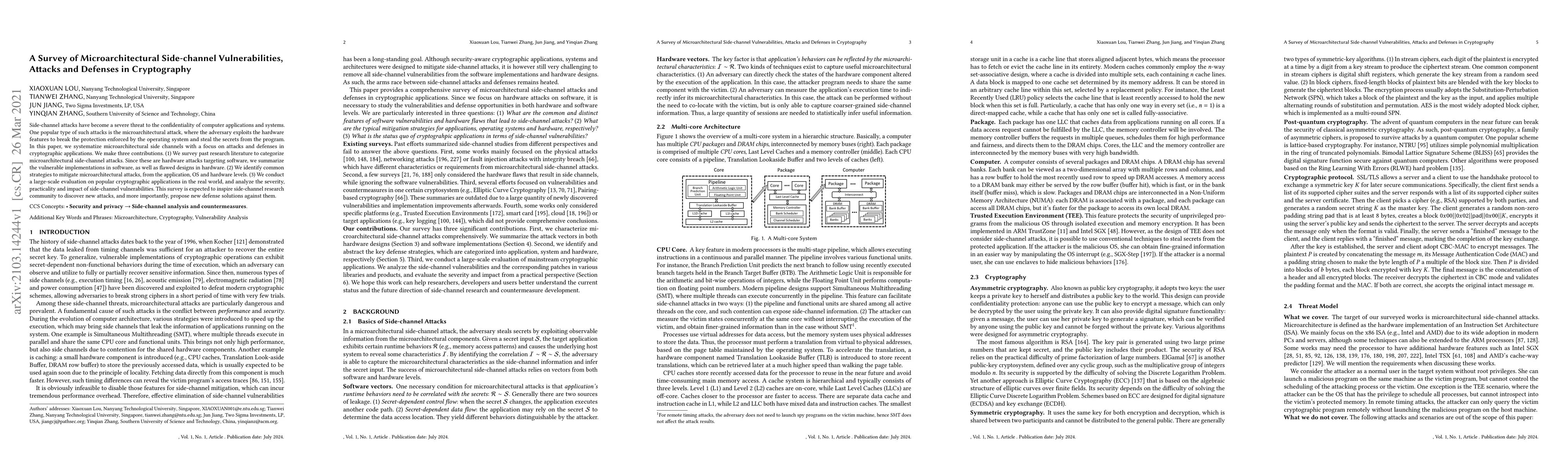 This paper categorizes microarchitectural side-channel attacks targeting cryptographic applications, summarizing vulnerable implementations and flawed hardware designs. It also identifies mitigation strategies and evaluates the severity of side-channel vulnerabilities in popular cryptographic applications, aiming to inspire new defense research.