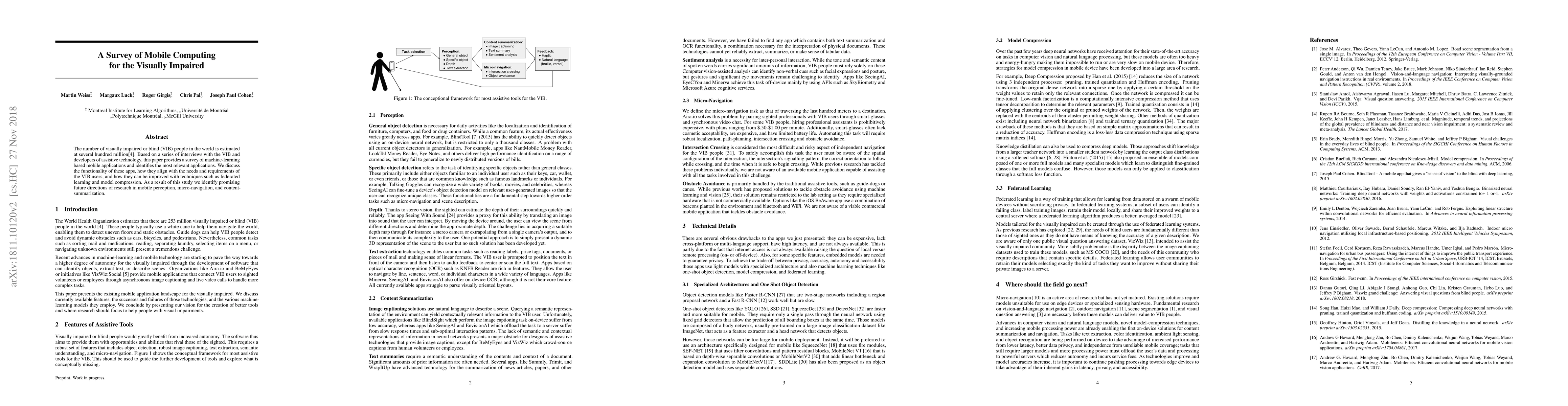 The number of visually impaired or blind (VIB) people in the world is estimated at several hundred million. Based on a series of interviews with the VIB and developers of assistive technology, this paper provides a survey of machine-learning based mobile applications and identifies the most relevant applications. We discuss the functionality of these apps, how they align with the needs and requirements of the VIB users, and how they can be improved with techniques such as federated learning and model compression. As a result of this study we identify promising future directions of research in mobile perception, micro-navigation, and content-summarization.