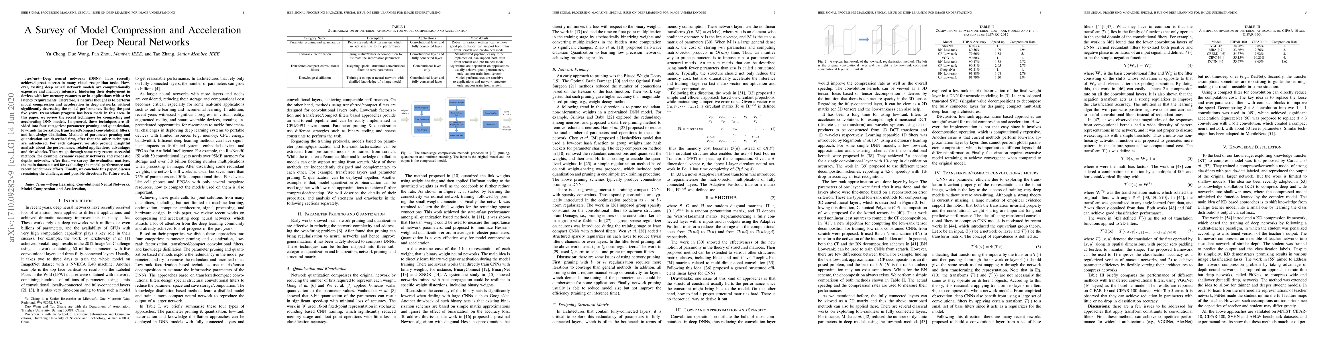 This paper surveys recent techniques for compressing and accelerating deep neural networks, categorizing them into parameter pruning, quantization, low-rank factorization, and knowledge distillation. It analyzes performance, applications, advantages, and drawbacks of each method, and discusses future challenges and directions.
