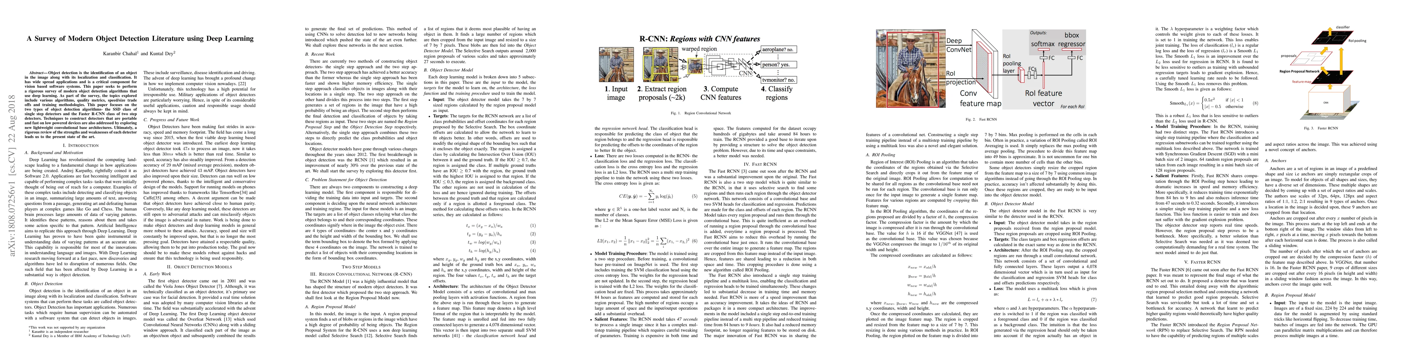 Object detection is the identification of an object in the image along with its localisation and classification. It has wide spread applications and is a critical component for vision based software systems. This paper seeks to perform a rigorous survey of modern object detection algorithms that use deep learning. As part of the survey, the topics explored include various algorithms, quality metrics, speed/size trade offs and training methodologies. This paper focuses on the two types of object detection algorithms- the SSD class of single step detectors and the Faster R-CNN class of two step detectors. Techniques to construct detectors that are portable and fast on low powered devices are also addressed by exploring new lightweight convolutional base architectures. Ultimately, a rigorous review of the strengths and weaknesses of each detector leads us to the present state of the art.