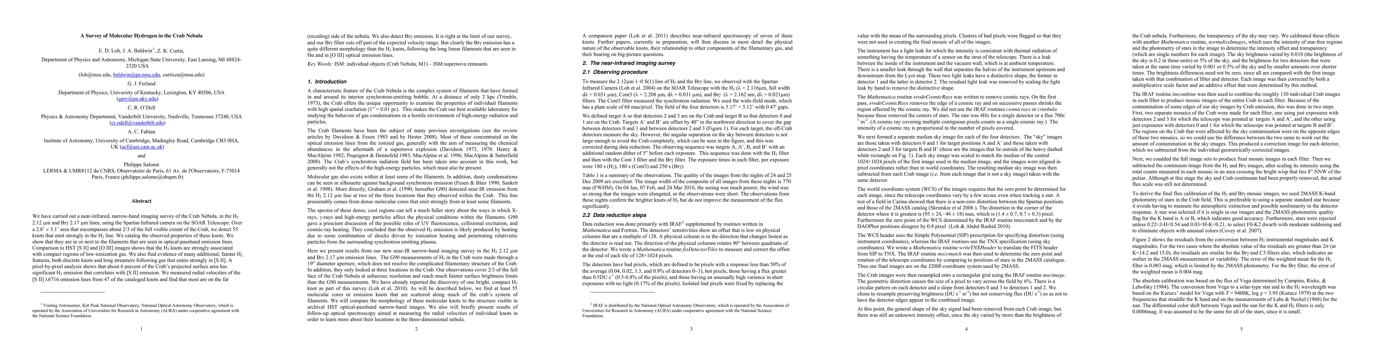 We have carried out a near-infrared, narrow-band imaging survey of the Crab Nebula, in the H2 2.12 micron and Br-gamma 2.17 micron lines, using the Spartan Infrared camera on the SOAR Telescope. Over a 2.8' x 5.1' area that encompasses about 2/3 of the full visible extent of the Crab, we detect 55 knots that emit strongly in the H2 line. We catalog the observed properties of these knots. We show that they are in or next to the filaments that are seen in optical-passband emission lines. Comparison to HST [S II] and [O III] images shows that the H2 knots are strongly associated with compact regions of low-ionization gas. We also find evidence of many additional, fainter H2 features, both discrete knots and long streamers following gas that emits strongly in [S II]. A pixel-by-pixel analysis shows that about 6 percent of the Crab's projected surface area has significant H2 emission that correlates with [S II] emission. We measured radial velocities of the [S II] lambda6716 emission lines from 47 of the cataloged knots and find that most are on the far (receding) side of the nebula. We also detect Br-gamma emission. It is right at the limit of our survey, and our Br-gamma filter cuts off part of the expected velocity range. But clearly the Br-gamma emission has a quite different morphology than the H2 knots, following the long linear filaments that are seen in H-alpha and in [O III] optical emission lines.