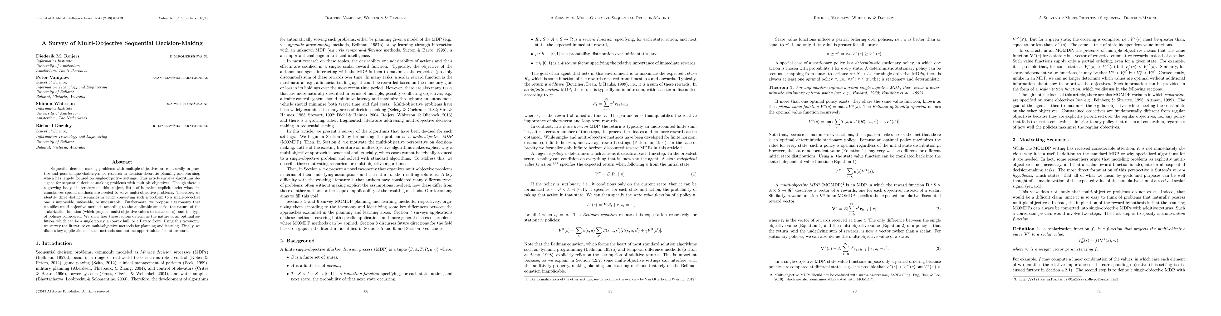 Sequential decision-making problems with multiple objectives arise naturally in practice and pose unique challenges for research in decision-theoretic planning and learning, which has largely focused on single-objective settings. This article surveys algorithms designed for sequential decision-making problems with multiple objectives. Though there is a growing body of literature on this subject, little of it makes explicit under what circumstances special methods are needed to solve multi-objective problems. Therefore, we identify three distinct scenarios in which converting such a problem to a single-objective one is impossible, infeasible, or undesirable. Furthermore, we propose a taxonomy that classifies multi-objective methods according to the applicable scenario, the nature of the scalarization function (which projects multi-objective values to scalar ones), and the type of policies considered. We show how these factors determine the nature of an optimal solution, which can be a single policy, a convex hull, or a Pareto front. Using this taxonomy, we survey the literature on multi-objective methods for planning and learning. Finally, we discuss key applications of such methods and outline opportunities for future work.