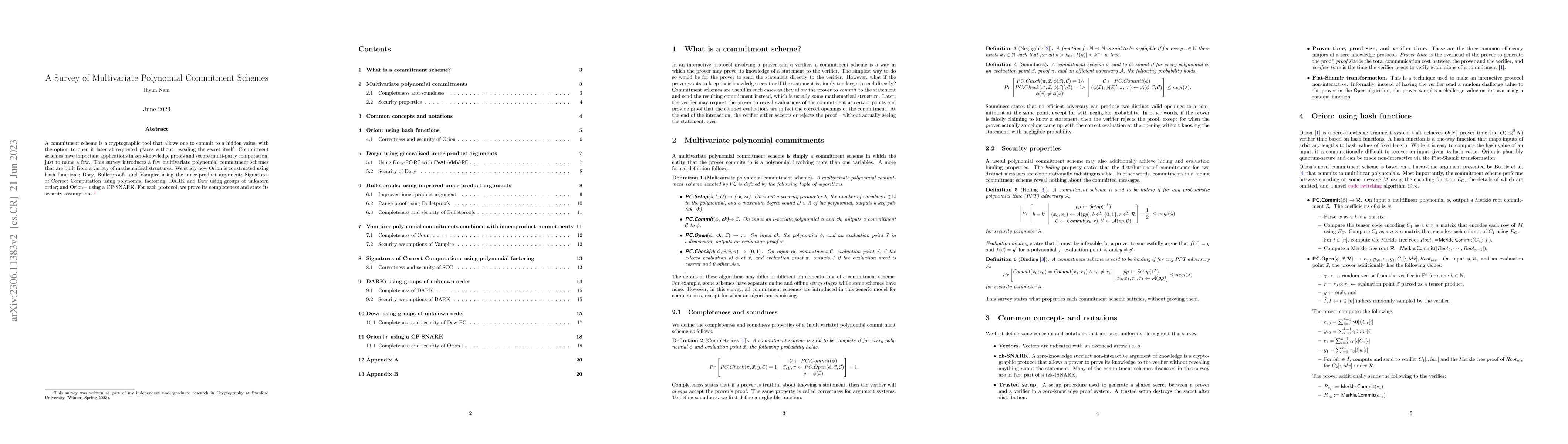 This survey explores various multivariate polynomial commitment schemes, highlighting their constructions and security assumptions. It covers schemes like Orion, Dory, Bulletproofs, Vampire, DARK, Dew, and Orion+, each built from different mathematical structures and applications in zero-knowledge proofs and secure multi-party computation.