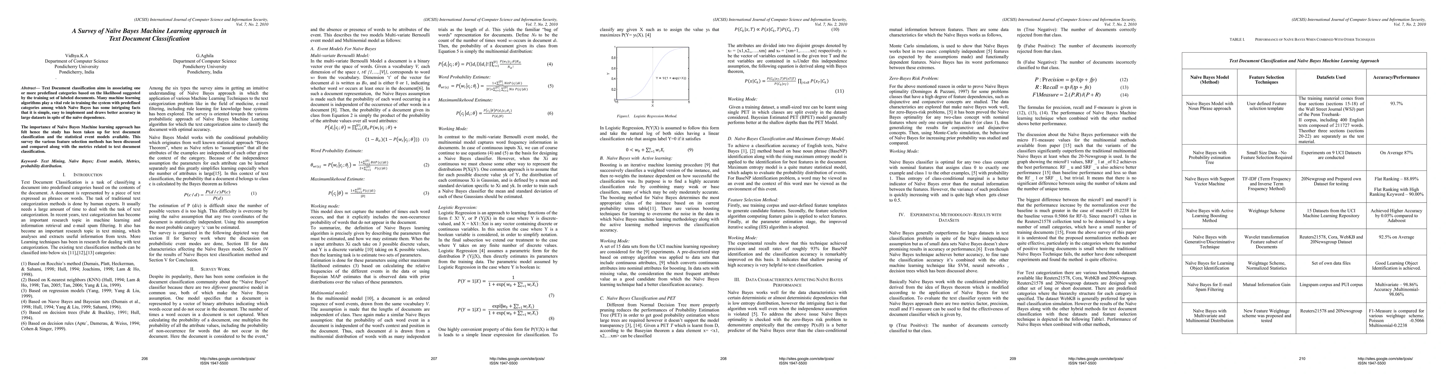 This paper surveys the Na\"ive Bayes machine learning approach for text document classification, highlighting its simplicity, ease of implementation, and effectiveness in large datasets, despite its na\"ive assumptions. It compares various feature selection methods and metrics used in text document classification.