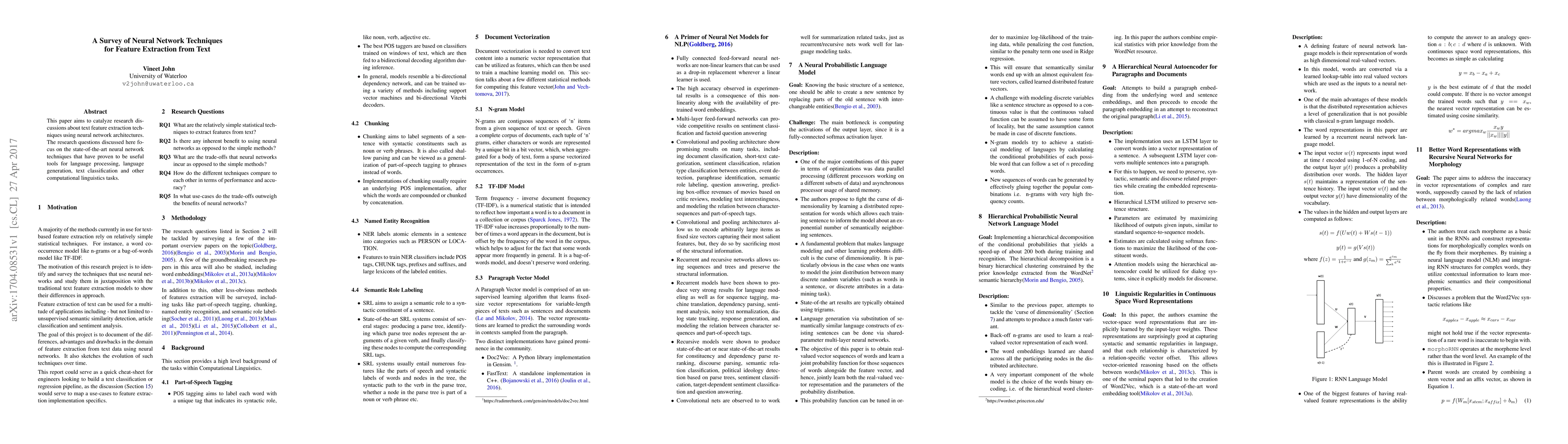 This paper aims to catalyze the discussions about text feature extraction techniques using neural network architectures. The research questions discussed in the paper focus on the state-of-the-art neural network techniques that have proven to be useful tools for language processing, language generation, text classification and other computational linguistics tasks.