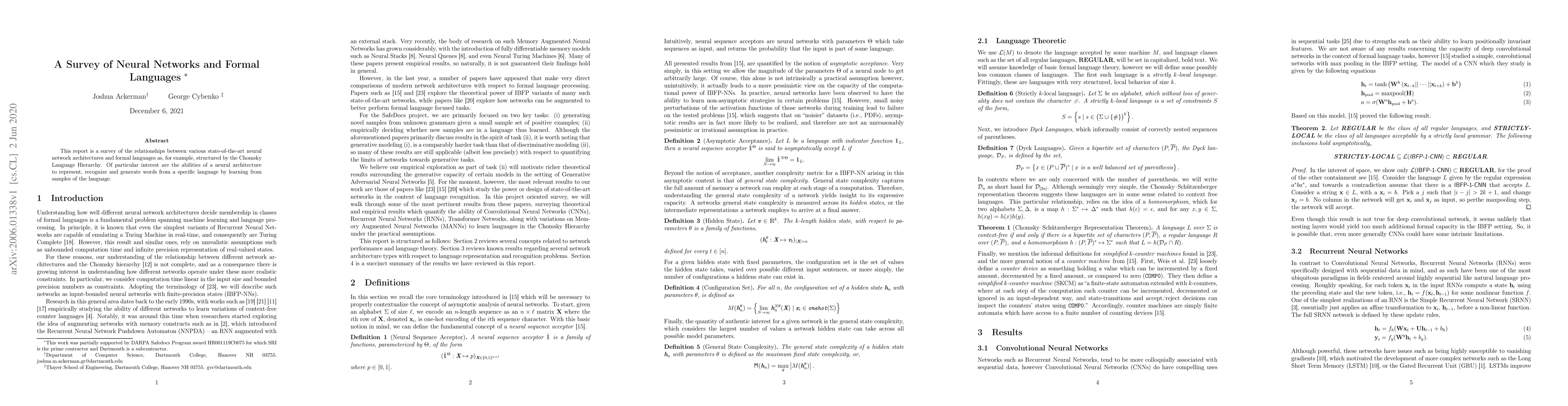 This report is a survey of the relationships between various state-of-the-art neural network architectures and formal languages as, for example, structured by the Chomsky Language Hierarchy. Of particular interest are the abilities of a neural architecture to represent, recognize and generate words from a specific language by learning from samples of the language.