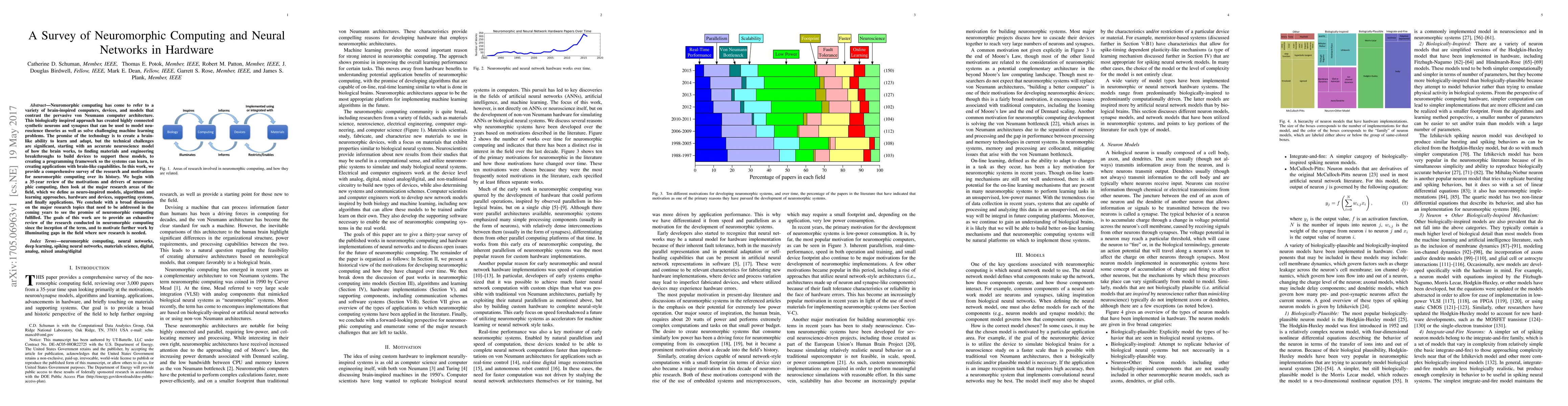Neuromorphic computing has come to refer to a variety of brain-inspired computers, devices, and models that contrast the pervasive von Neumann computer architecture. This biologically inspired approach has created highly connected synthetic neurons and synapses that can be used to model neuroscience theories as well as solve challenging machine learning problems. The promise of the technology is to create a brain-like ability to learn and adapt, but the technical challenges are significant, starting with an accurate neuroscience model of how the brain works, to finding materials and engineering breakthroughs to build devices to support these models, to creating a programming framework so the systems can learn, to creating applications with brain-like capabilities. In this work, we provide a comprehensive survey of the research and motivations for neuromorphic computing over its history. We begin with a 35-year review of the motivations and drivers of neuromorphic computing, then look at the major research areas of the field, which we define as neuro-inspired models, algorithms and learning approaches, hardware and devices, supporting systems, and finally applications. We conclude with a broad discussion on the major research topics that need to be addressed in the coming years to see the promise of neuromorphic computing fulfilled. The goals of this work are to provide an exhaustive review of the research conducted in neuromorphic computing since the inception of the term, and to motivate further work by illuminating gaps in the field where new research is needed.