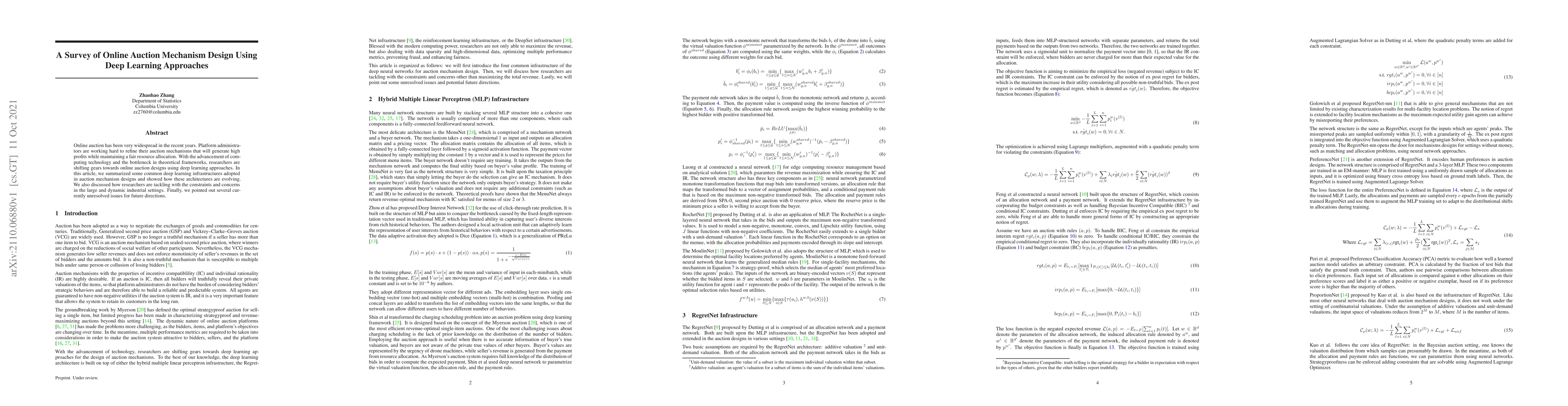 Online auction has been very widespread in the recent years. Platform administrators are working hard to refine their auction mechanisms that will generate high profits while maintaining a fair resource allocation. With the advancement of computing technology and the bottleneck in theoretical frameworks, researchers are shifting gears towards online auction designs using deep learning approaches. In this article, we summarized some common deep learning infrastructures adopted in auction mechanism designs and showed how these architectures are evolving. We also discussed how researchers are tackling with the constraints and concerns in the large and dynamic industrial settings. Finally, we pointed out several currently unresolved issues for future directions.