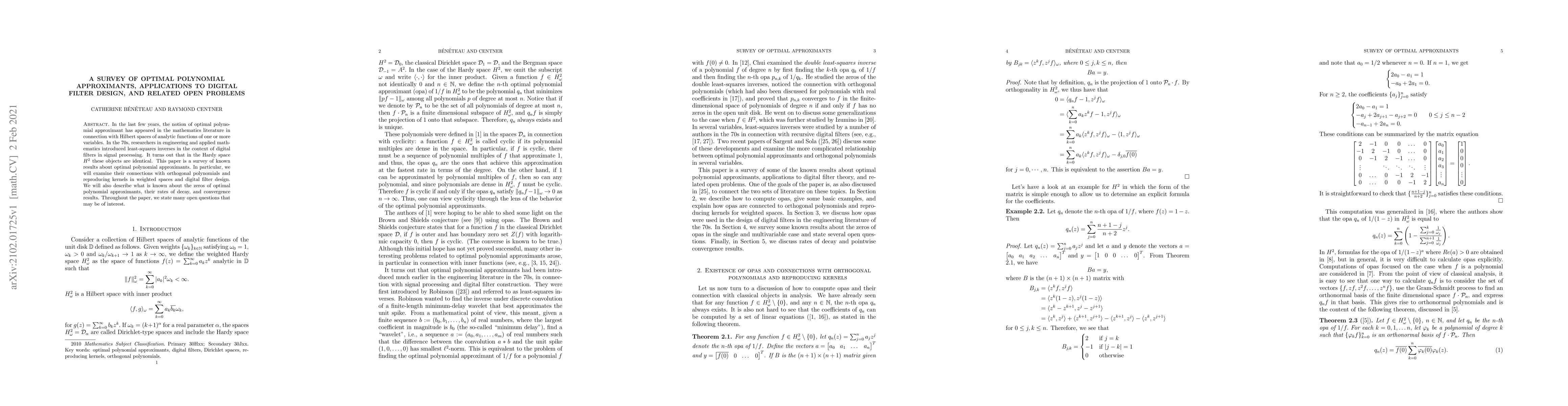 This paper surveys optimal polynomial approximants, linking them to digital filter design and exploring their connections with orthogonal polynomials and reproducing kernels. It also discusses the zeros, decay rates, and convergence of these approximants, while highlighting several open problems for future research.