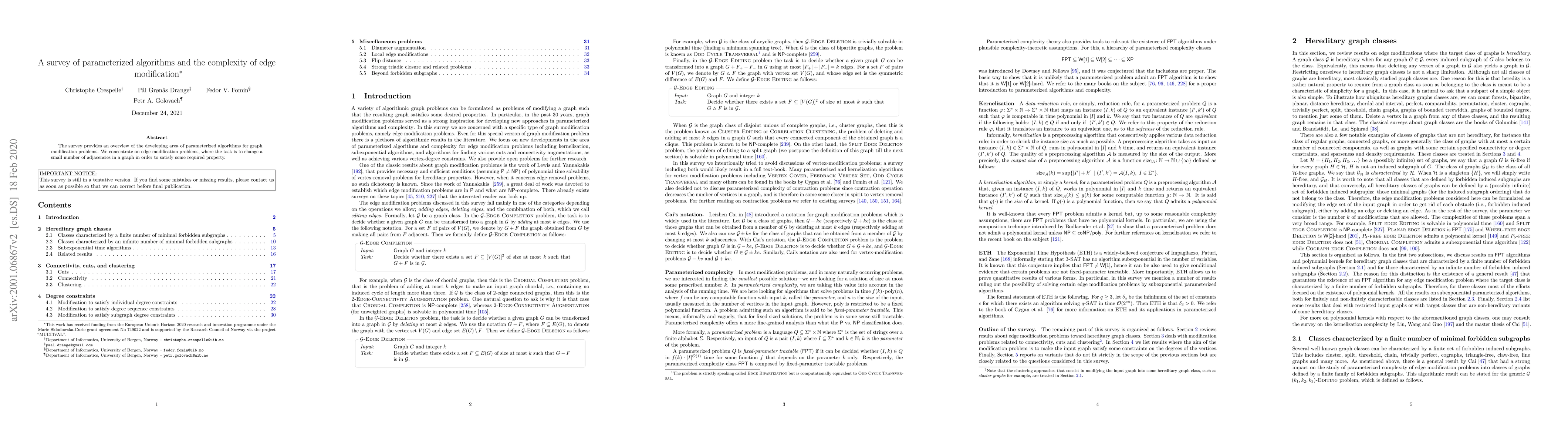 Two-line summary: This survey delves into the field of parameterized algorithms specifically addressing graph modification problems that require changing a few edges to meet certain criteria. It highlights the complexity and approaches used in solving these problems efficiently through parameterization.