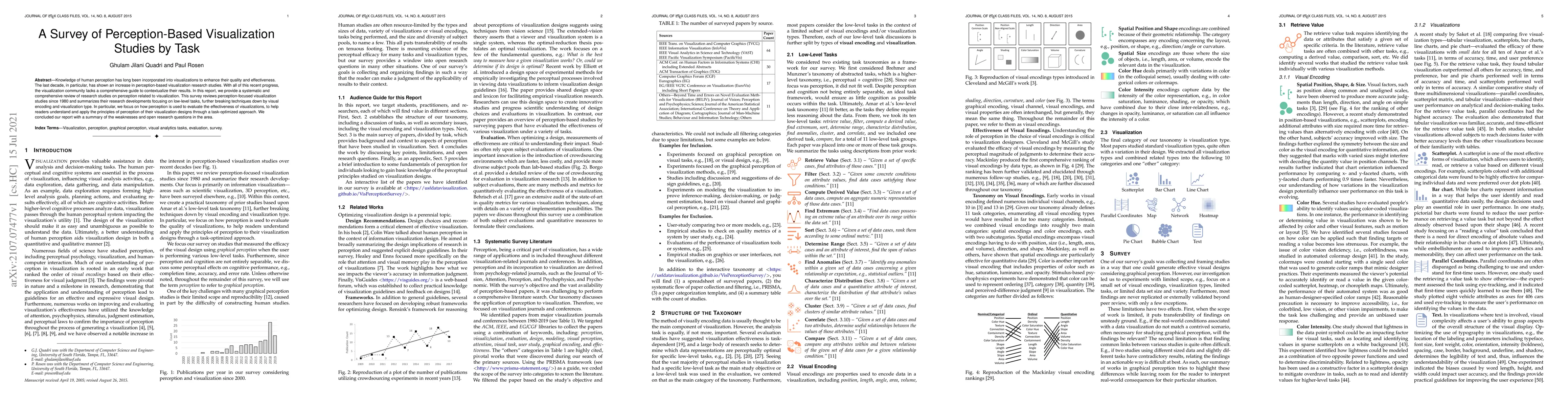 Knowledge of human perception has long been incorporated into visualizations to enhance their quality and effectiveness. The last decade, in particular, has shown an increase in perception-based visualization research studies. With all of this recent progress, the visualization community lacks a comprehensive guide to contextualize their results. In this report, we provide a systematic and comprehensive review of research studies on perception related to visualization. This survey reviews perception-focused visualization studies since 1980 and summarizes their research developments focusing on low-level tasks, further breaking techniques down by visual encoding and visualization type. In particular, we focus on how perception is used to evaluate the effectiveness of visualizations, to help readers understand and apply the principles of perception of their visualization designs through a task-optimized approach. We concluded our report with a summary of the weaknesses and open research questions in the area.