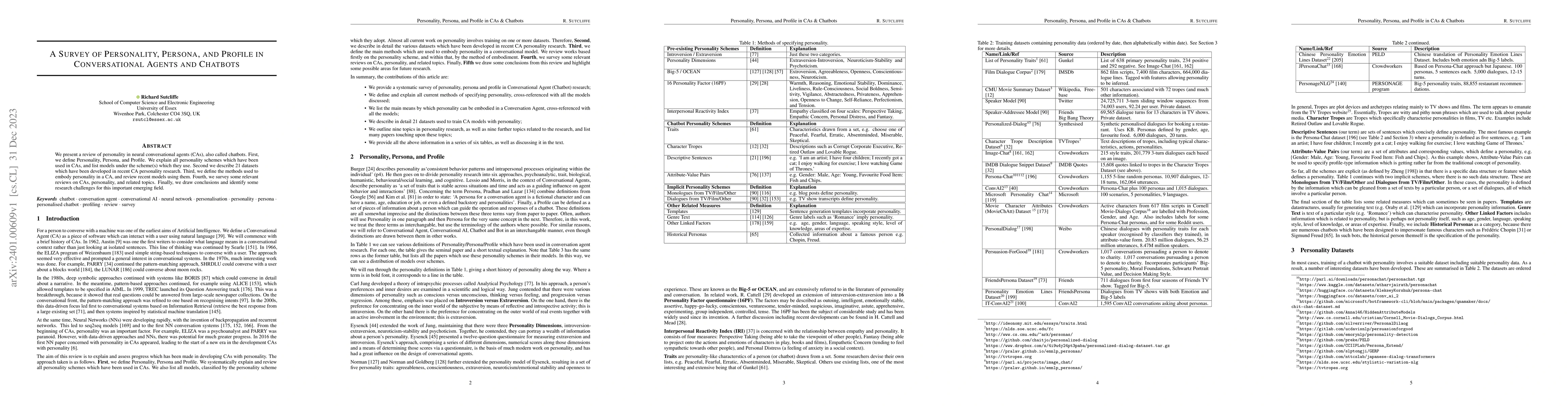 This paper reviews personality, persona, and profile concepts in conversational agents and chatbots, detailing various personality schemes and models used, datasets developed, and methods for embodying personality. It also surveys relevant reviews and identifies research challenges in this emerging field.