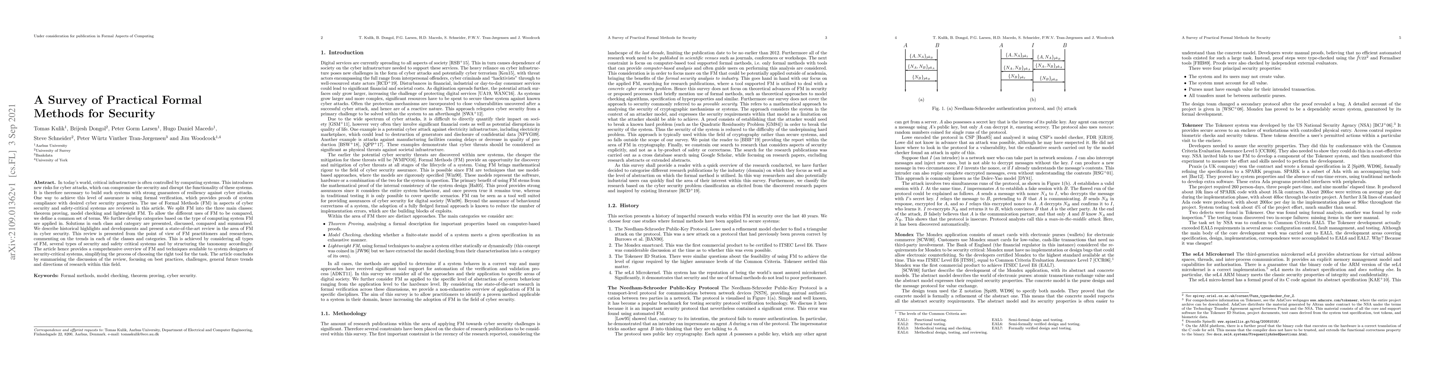 This paper reviews practical formal methods for security, comparing theorem proving, model checking, and lightweight FM in various computing systems, providing a comprehensive overview of techniques available to system designers of security-critical systems.