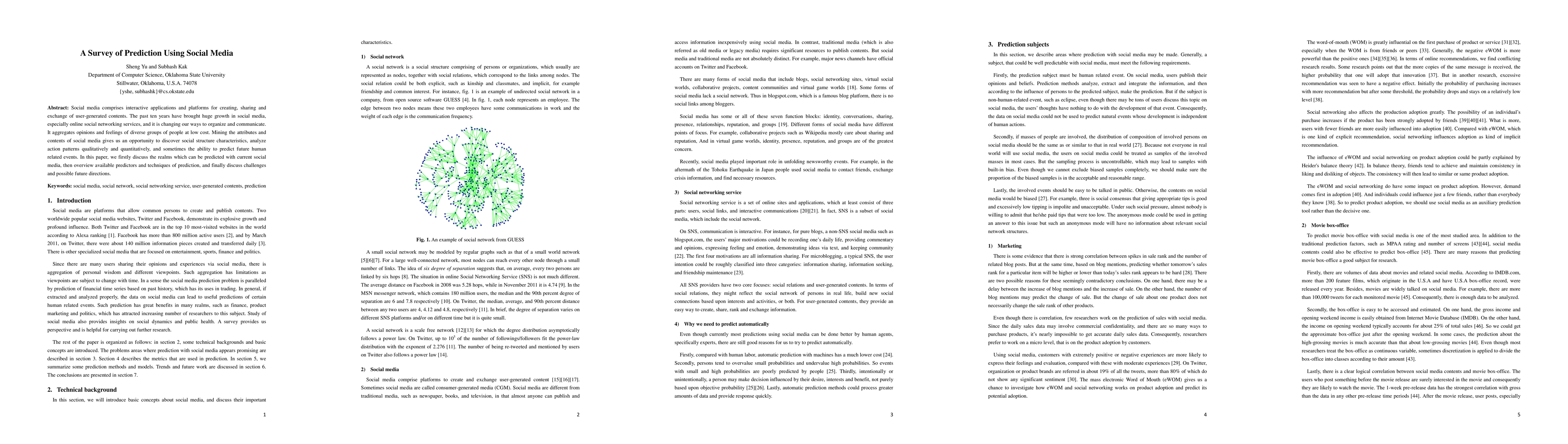 Social media comprises interactive applications and platforms for creating, sharing and exchange of user-generated contents. The past ten years have brought huge growth in social media, especially online social networking services, and it is changing our ways to organize and communicate. It aggregates opinions and feelings of diverse groups of people at low cost. Mining the attributes and contents of social media gives us an opportunity to discover social structure characteristics, analyze action patterns qualitatively and quantitatively, and sometimes the ability to predict future human related events. In this paper, we firstly discuss the realms which can be predicted with current social media, then overview available predictors and techniques of prediction, and finally discuss challenges and possible future directions.