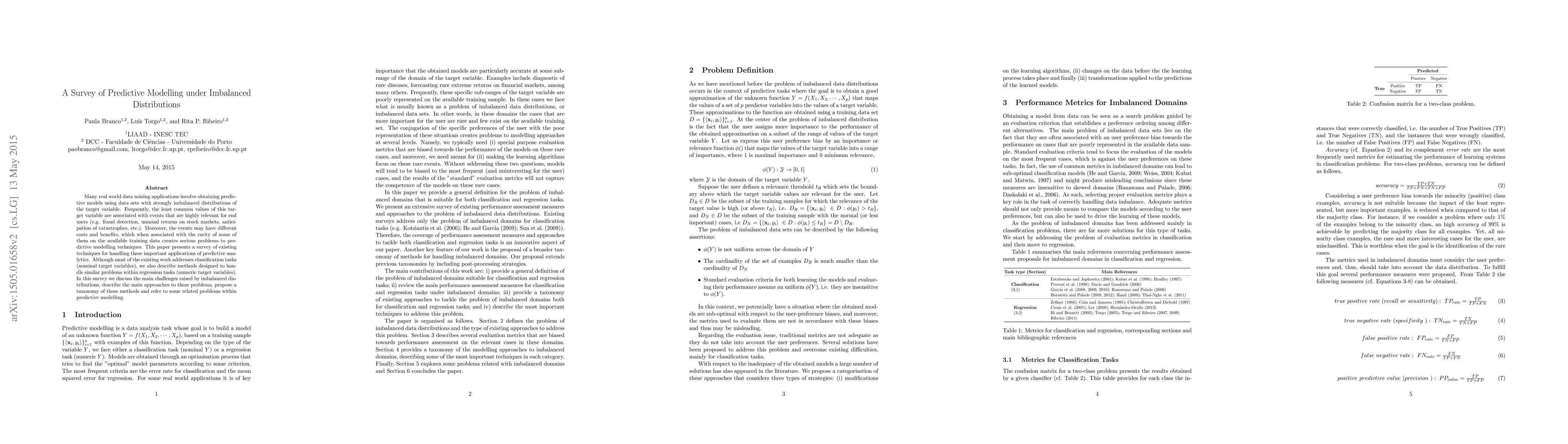 This paper reviews methods for building predictive models when data is heavily imbalanced, especially in cases like fraud detection or rare events. It explains the main challenges, categorizes existing techniques, and discusses solutions for both classification and regression tasks.