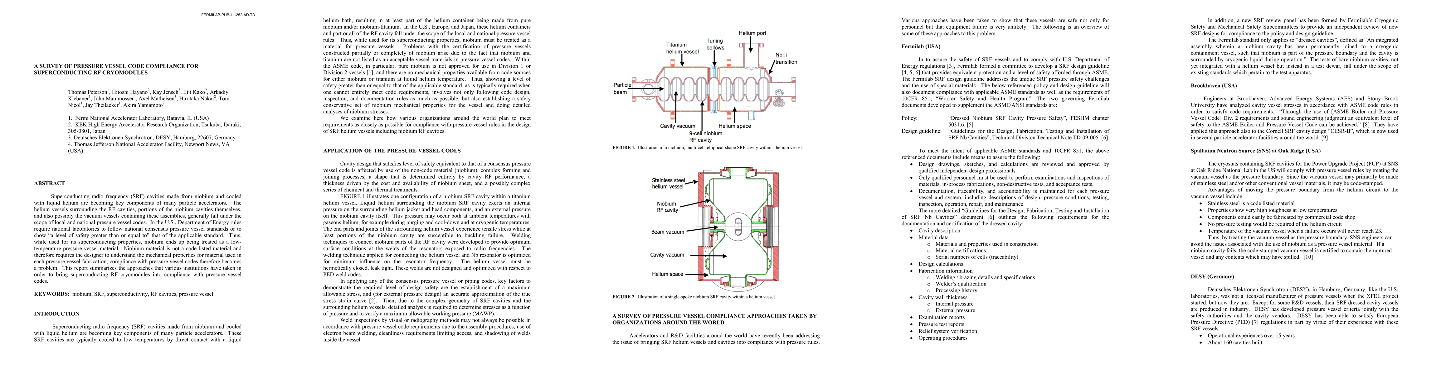 Superconducting radio frequency (SRF) cavities made from niobium and cooled with liquid helium are becoming key components of many particle accelerators. The helium vessels surrounding the RF cavities, portions of the niobium cavities themselves, and also possibly the vacuum vessels containing these assemblies, generally fall under the scope of local and national pressure vessel codes. In the U.S., Department of Energy rules require national laboratories to follow national consensus pressure vessel standards or to show "a level of safety greater than or equal to" that of the applicable standard. Thus, while used for its superconducting properties, niobium ends up being treated as a low-temperature pressure vessel material. Niobium material is not a code listed material and therefore requires the designer to understand the mechanical properties for material used in each pressure vessel fabrication; compliance with pressure vessel codes therefore becomes a problem. This report summarizes the approaches that various institutions have taken in order to bring superconducting RF cryomodules into compliance with pressure vessel codes.